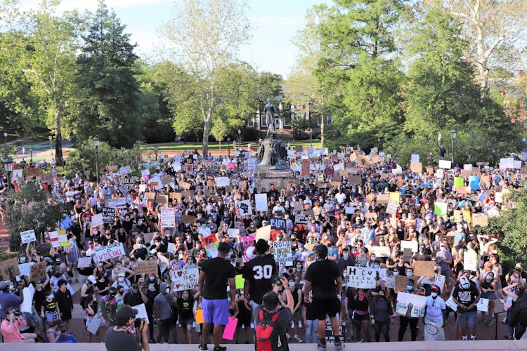When the march reached University Avenue’s border with the University’s Grounds, the bells of nearby St. Paul’s Memorial Church rang out as demonstrators cheered and continued chanting antiracist slogans in unison. The crowd then engulfed the north side of the Rotunda, crowding around the Thomas Jefferson statue and onto the Rotunda’s marble steps. Despite the crowded conditions of the protest, the vast majority of demonstrators wore face coverings in light of the ongoing COVID-19 pandemic.
