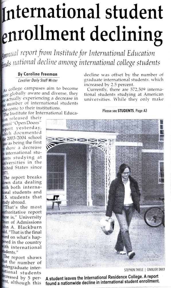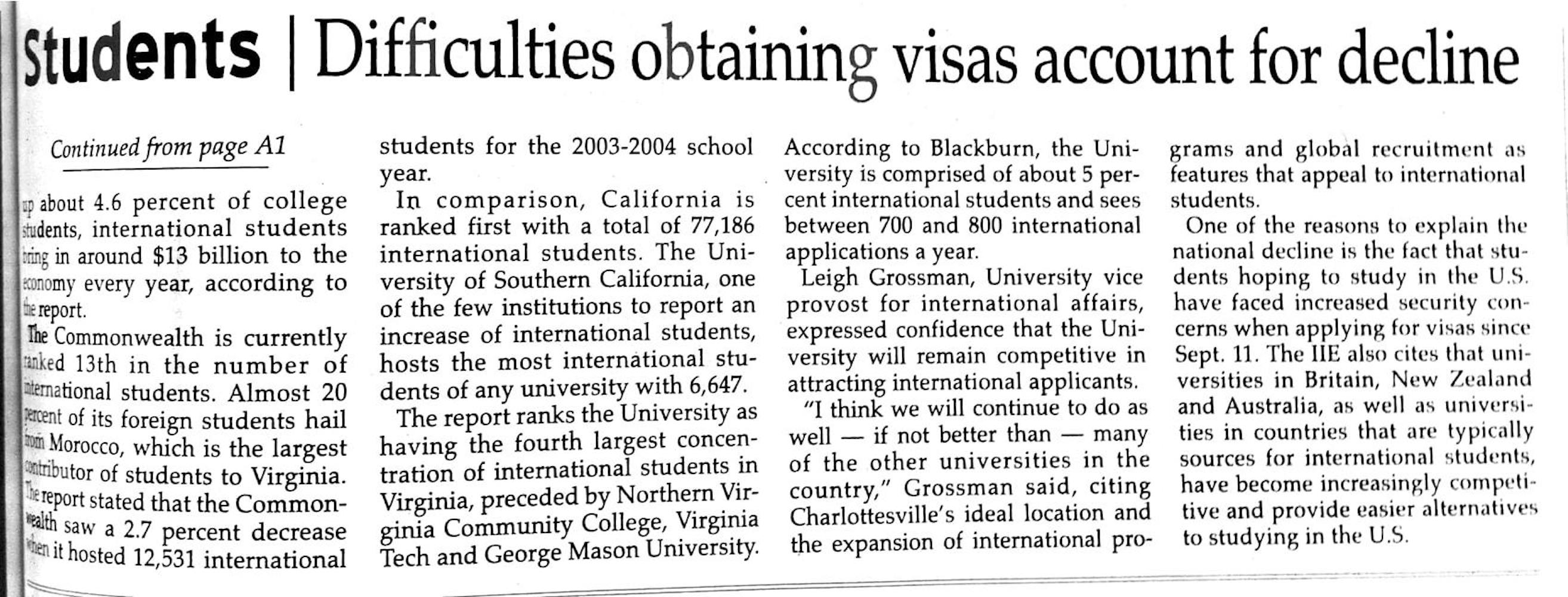 This article describes how, for the first time in more than thirty years, the number of international students enrolled in U.S. universities fell during the 2003–2004 academic year, according to a report published by the Institute for International Education. Students' increased security concerns and visa application challenges following September 11th, as well as increased competition from universities in other English-speaking nations, were major factors in this decline. Vice Provost for International Affairs Leigh Grossman expressed confidence that the University would continue to attract applicants despite a decline in undergraduate international enrollment.