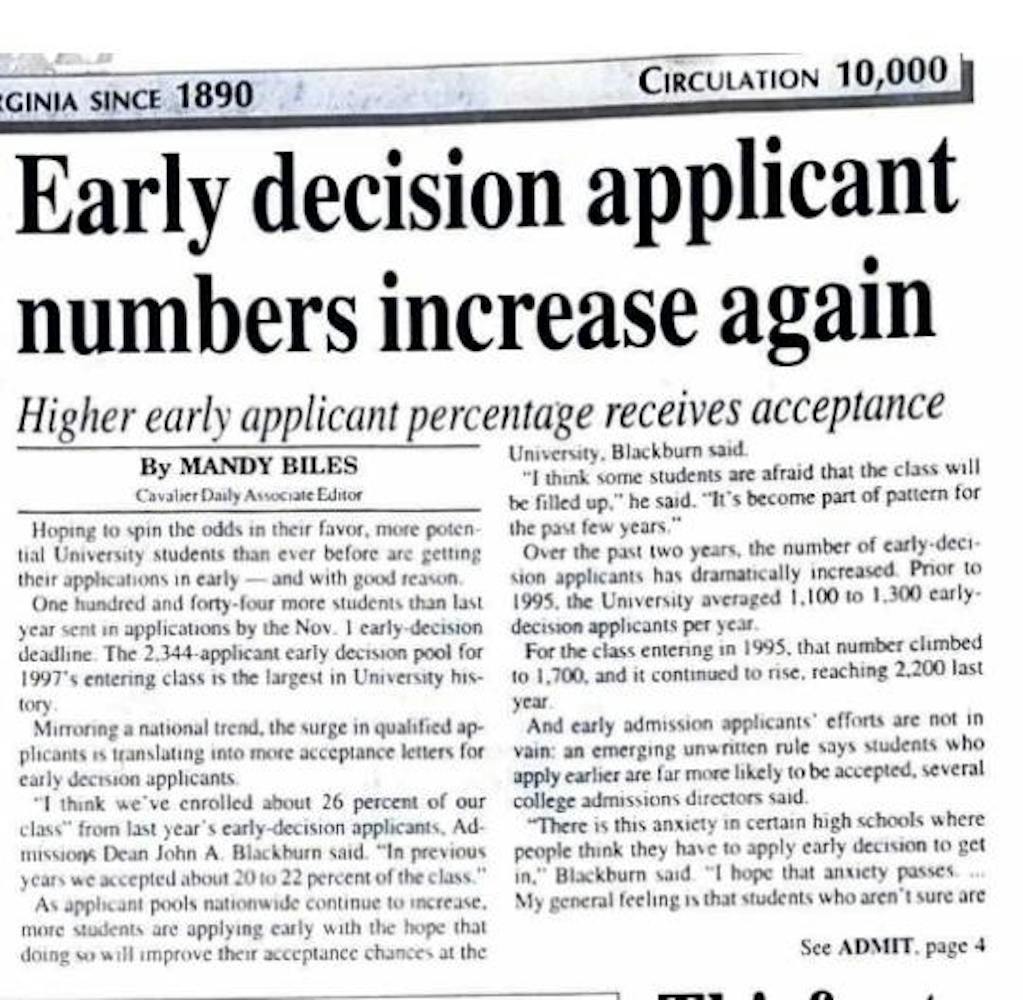 More and more students were applying to the University each year. A rising number of applicants pushed prospective students to submit early decision applications. Admissions officials feel that there is a correlation between high achieving students and those who submit early applications.