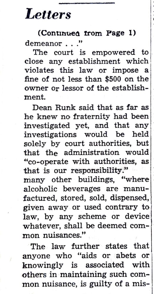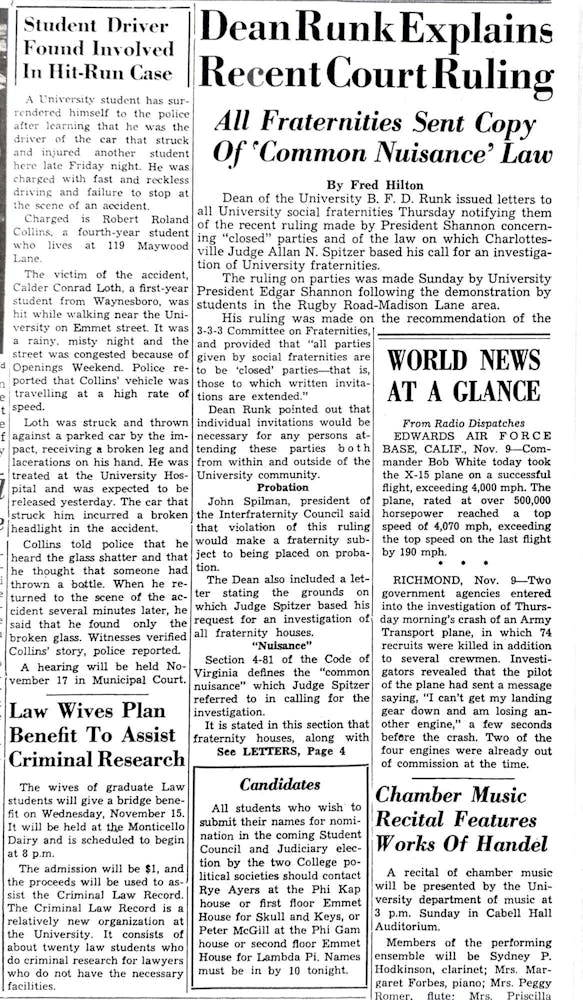This article describes when Dean B. F. D. Runk sent a letter to each fraternity house restricting parties to invited guests only, following disturbances in the Rugby Road-Madison Lane area. The ruling was based on Judge Allan N. Spitzer's interpretation of Virginia's "common nuisance" law and cautioned fraternities that if they violated this ruling, they might face probation or investigation.