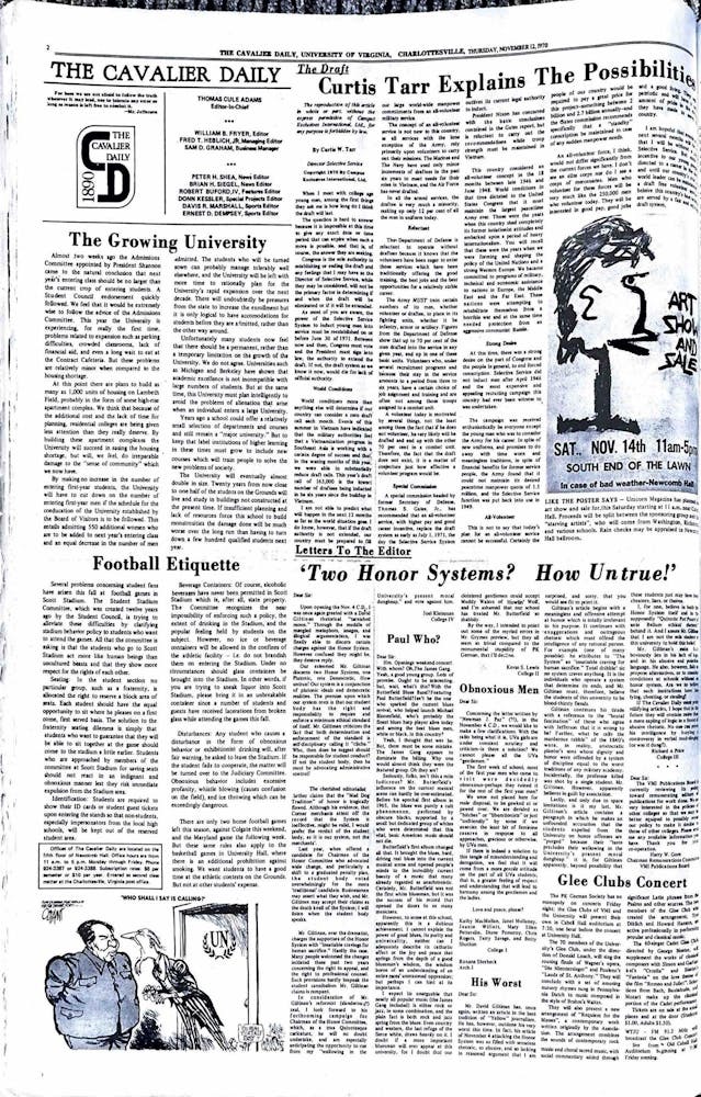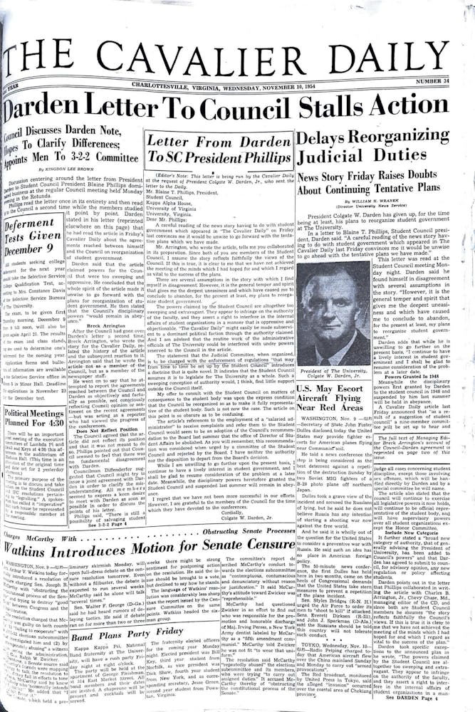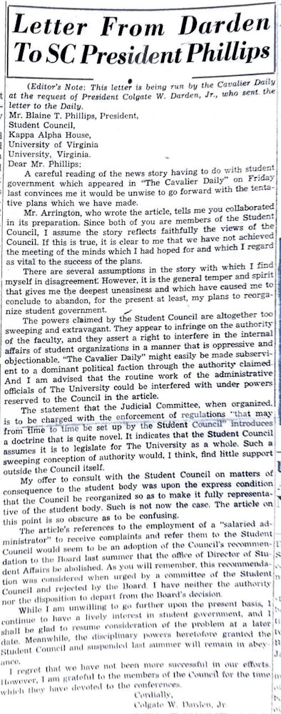 President Darden requested that The Cavalier Daily print a letter that he sent to the student council president. After reading a Cavalier Daily article discussing the reorganization of the student council, Darden felt uneasy about going forward with the reorganization plans. Darden believed that he and the student council had not yet reached alignment on the topic. The article illustrates the administration's effect on student life.