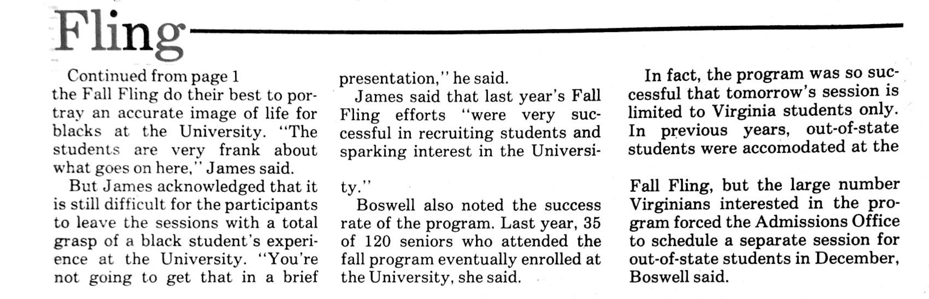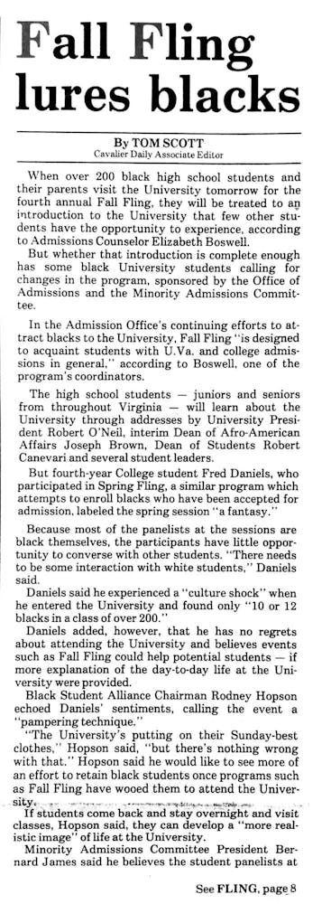 This article details the Fall Fling Program to recruit Black high school students via a "preview" of life at the University. Black Student Alliance Chairman Rodney Hopson said that the short event and limited time spent with white students was a “pampering technique,” though he felt it was well-meaning.