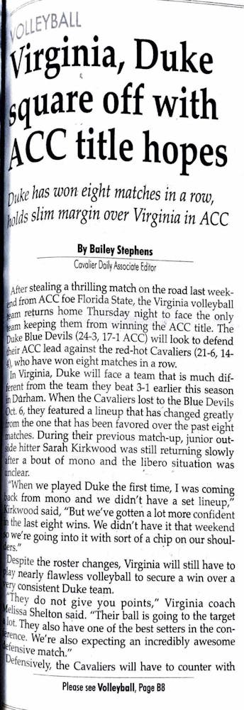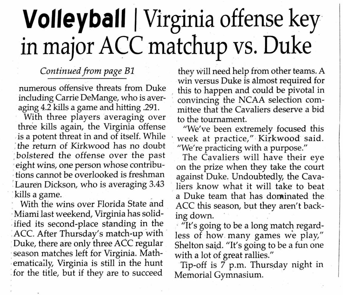 After winning eight matches in a row, Virginia volleyball needed to beat the Blue Devils to secure their 2006 ACC regular season title. The team had lost to Duke earlier that season but felt confident in their momentum from the win streak and the recovery of two of their best players. A win would not only confirm their title, but would also help convince the NCAA selection committee that the Cavaliers deserved a bid to the national tournament.