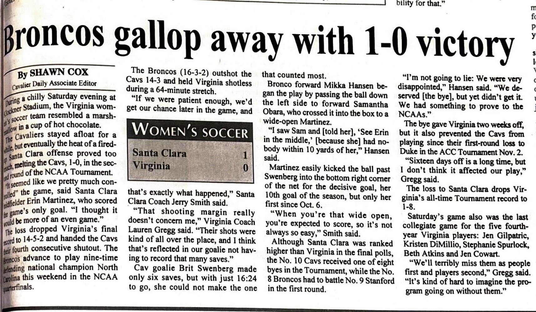 Virginia women's soccer fell to Santa Clara in the second round of the NCAA Tournament, which took place at Klӧckner Stadium. A dominant showing by Santa Clara’s offense kept Virginia scoreless and led the Broncos to a 1-0 victory. This was the final game for five senior players on the Virginia team, and the loss dropped Virginia’s all-time tournament record to 1-8.
