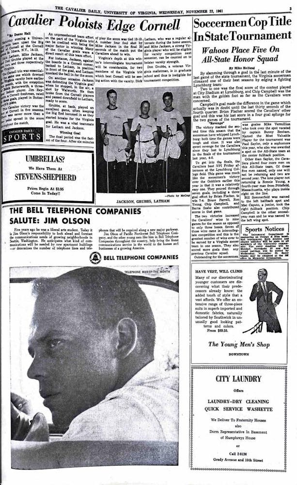 Virginia men’s Soccer clinched the 1961 state championship in the final minute of play, as sophomore forward Chip Cambell edged past Lynchburg College’s goalie to score the game-winning goal. The team was seeking payback for their 4-0 loss to Lynchburg in the previous year’s tournament, and placed five men who contributed to their win on the All-State team.