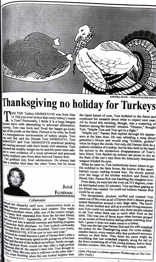 Tom the Turkey MMMXXVIII is forced to watch his best friend (also named Tom the Turkey) get “decapitated, plucked, stuffed and roasted” in a Thanksgiving tale by columnist Julie Floryan. Giving voice to the turkeys, the article offers a Rudolph-esque story of a young bird whose peers are selected for special “exercise and feeding” programs, programs Tom is deemed too small for. In the end, he finds this disadvantage to be quite the holiday miracle.