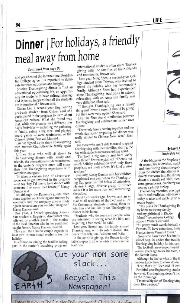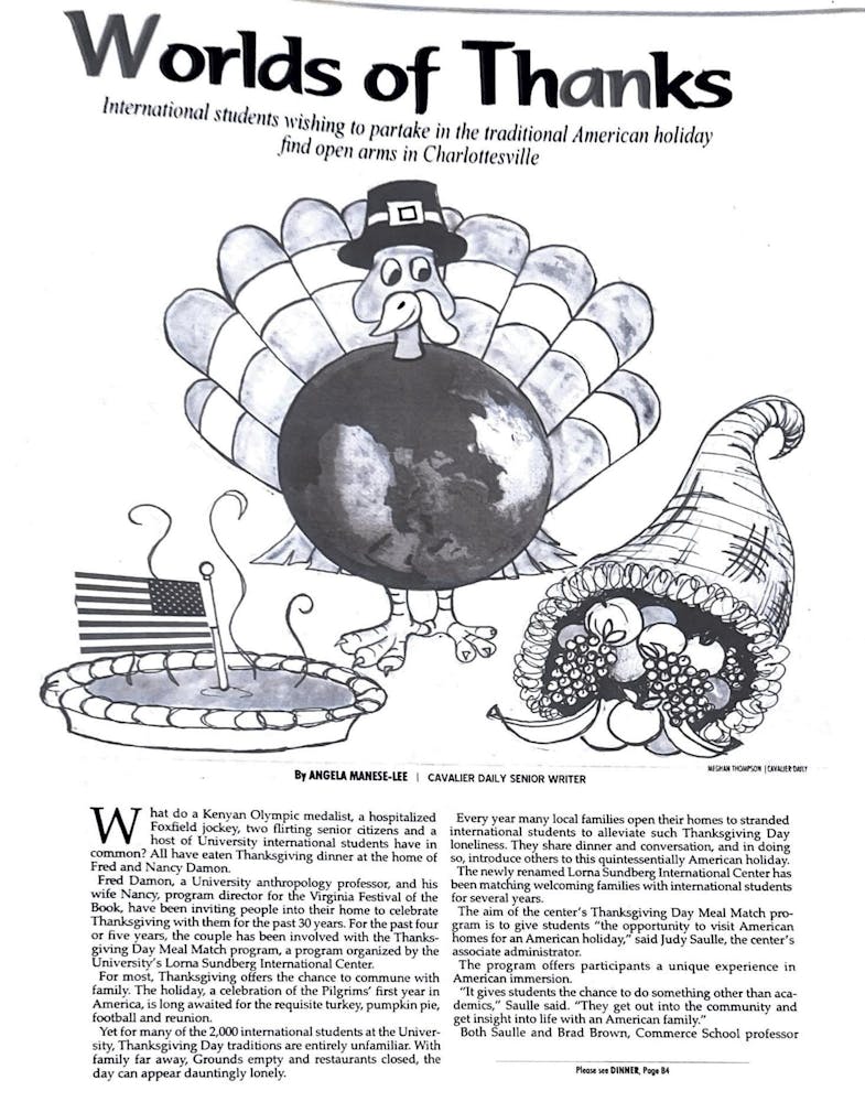 The Thanksgiving season can be daunting for international students, who often feel left out or lonely as Grounds is abandoned and decorated for a uniquely American holiday, but programs like the Thanksgiving Day Meal Match can help connect them with faculty and community members willing to open their doors. Many students bring their international roommates or friends home as well, defying the idea that Thanksgiving is just about family. The international students interviewed expressed similarities between the holiday and traditions from their home countries.