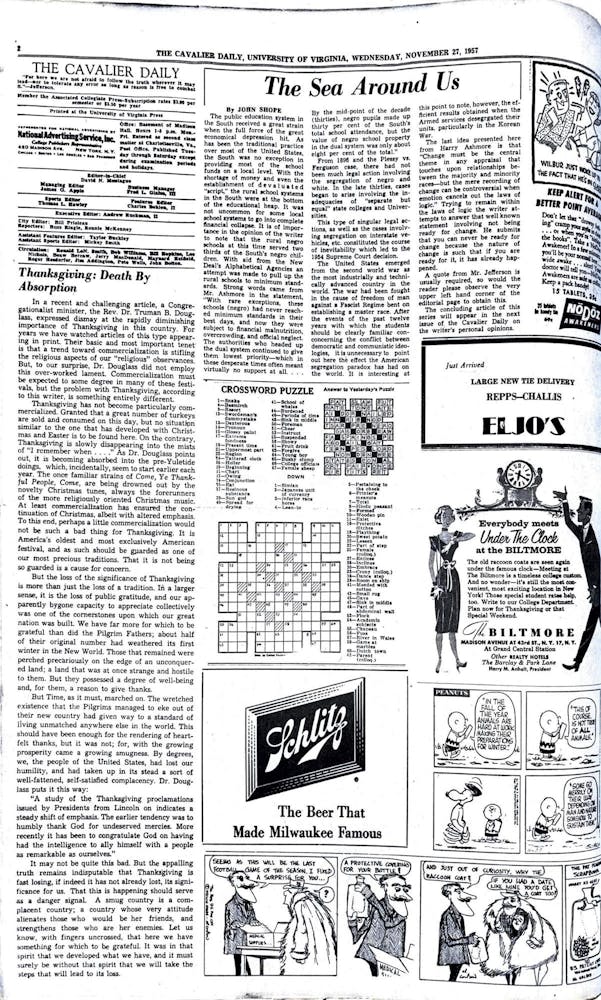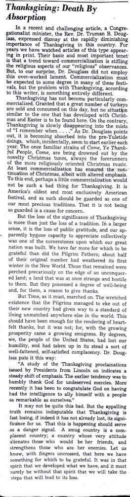 Reflecting on Rev. Dr. Truman B Douglass’s Thanksgiving dismay, this piece discusses the erosion of tradition and “public gratitude.” In defending the holiday, it theorizes that some degree of commercialism may protect Thanksgiving from disappearing into the tide of Christmas cheer. And if the Pilgrims could express gratitude for their “wretched existence,” it is only fitting that Americans recognize the gifts of 1957.