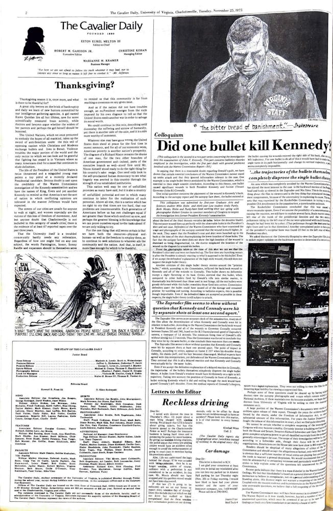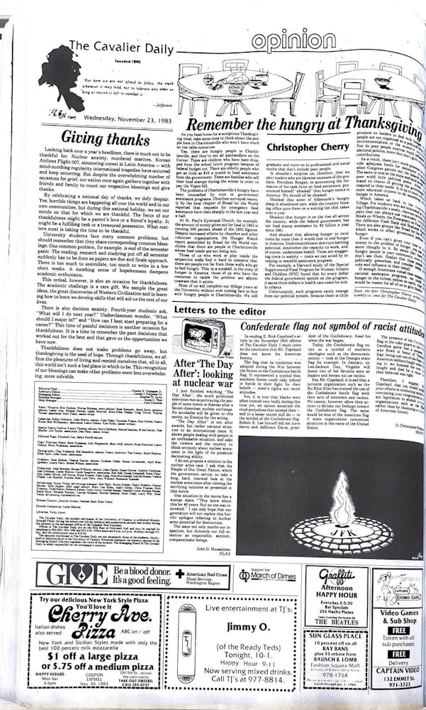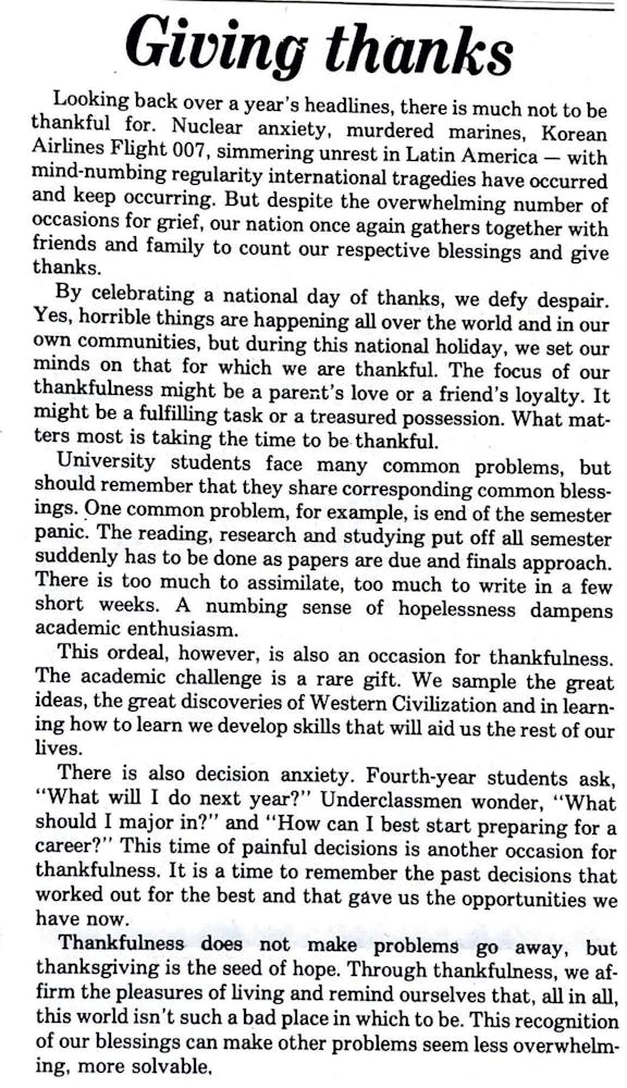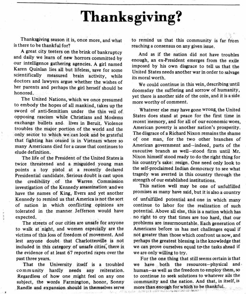 In a time of intense political, economic and social unrest, this 1975 article considers whether Thanksgiving gratitude is still possible. While violence persists, from war on the global stage to assassinations across American partisan lines and rapes on University Grounds, the piece nonetheless attempts to cultivate a hopeful attitude for the future. It celebrates a rare period of peacetime for the United States and the effectiveness of the government in forcing Nixon’s resignation, offering these as signs of the nation’s unfulfilled potential for greatness, one we can all be grateful for this Thanksgiving.