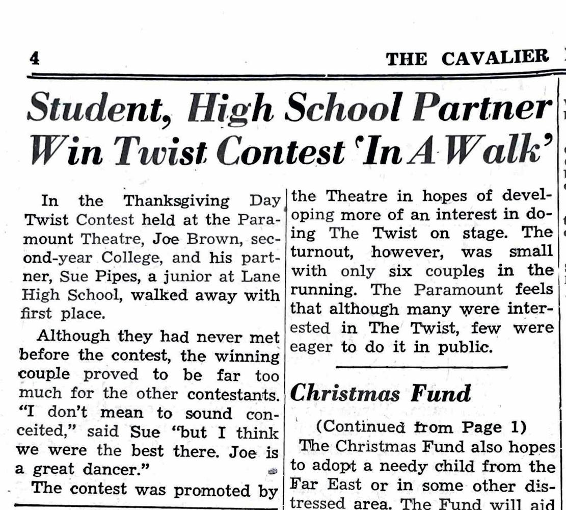 The Paramount Theatre hosted a Thanksgiving Day Twist Contest in hopes of boosting interest in doing The Twist onstage. While only six couples showed up, The Paramount hypothesized that interest in doing The Twist was quelled by fears of doing it in public. The winners, second-year College student Joe Brown and high school junior Sue Pipes, maintained that despite the small crowd, they really were the best dancers present.