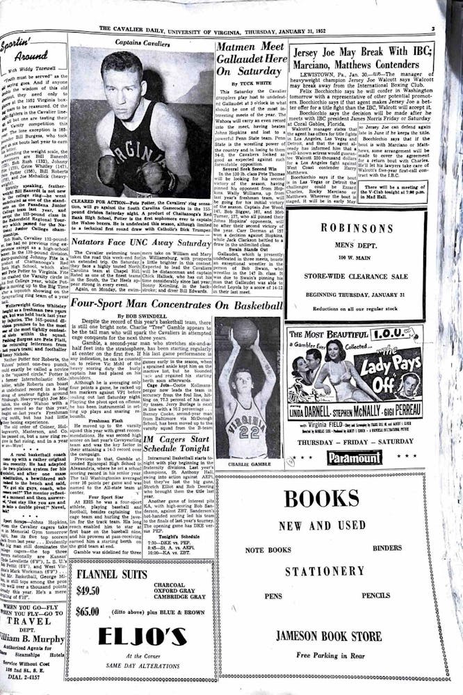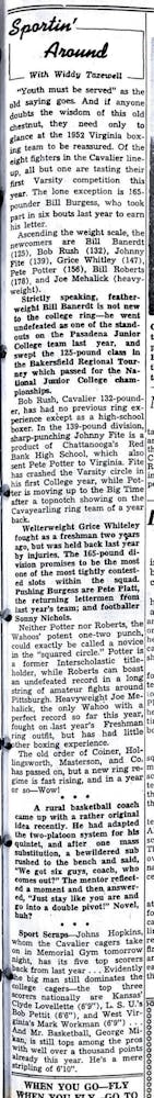 In this piece, Tazewell highlighted the Cavaliers’ boxing lineup, of which all but one were new members. He covers the newcomers’ boxing experiences, some coming from other colleges while others only had amateur experience. He ends the column with an anecdote about a basketball coach’s strategy and a recap on the division’s top basketball scorers.