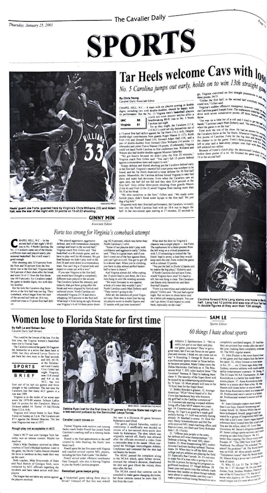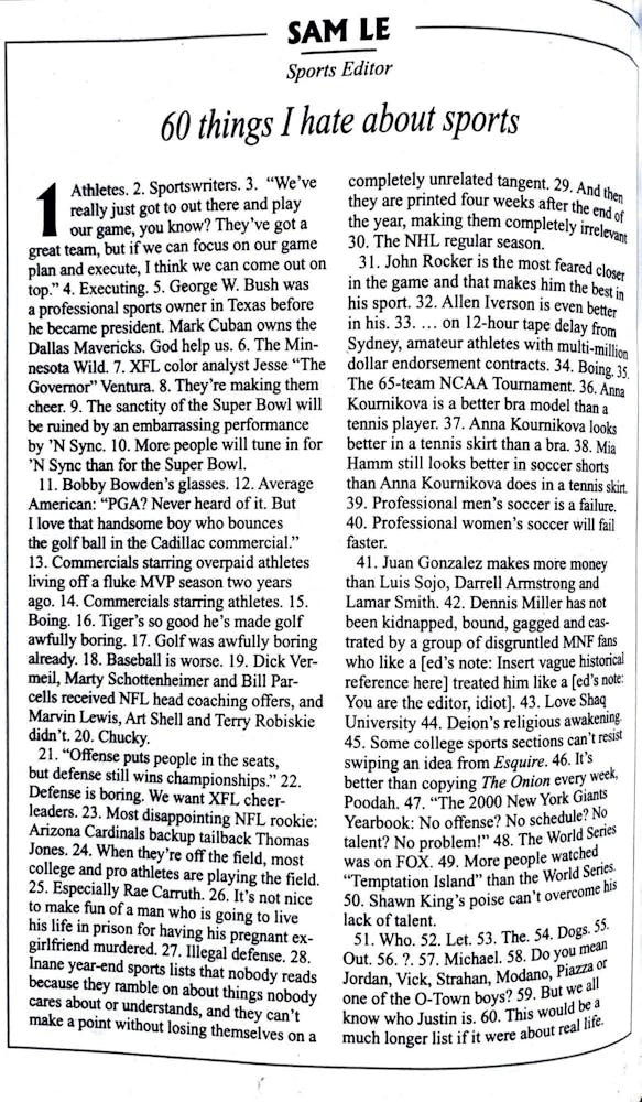 Taking shots at everyone from ’N Sync to George W. Bush, sports editor Sam Le critiques commercialization, defensive play and media clichés. He argues that the “sanctity” of the NFL is being eroded, while also dismissing baseball, golf, professional men’s soccer and the NHL’s regular season. While this piece is comedic and satirical, it is also reflective of early-2000s sports culture, as one of the only references to women's sports is debating which female athlete “looks better in soccer shorts.”
