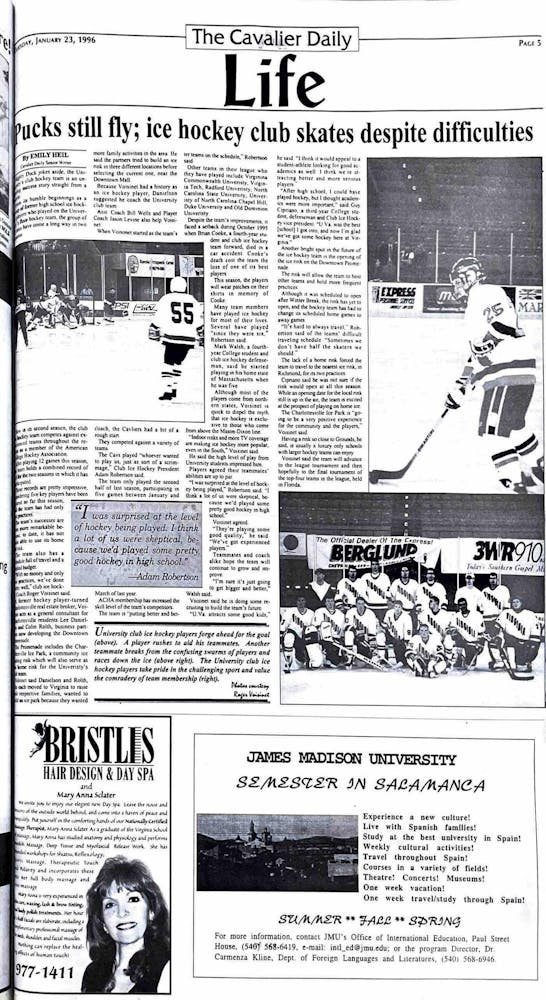 The University’s club ice hockey team faced a number of struggles, many of which stemmed from a lack of funding due to its club sport status. One of its greatest setbacks was a lack of a home rink, which forced them to practice in Richmond and travel for almost all games, which impacted their roster at several games. Another struggle the team grappled with was the loss of teammate Brian Cooke in October 1995, for whom the team honored by the addition of patches on their team shirts. Despite these difficulties, the team still continued to the league tournament and continued to grow in numbers due to recruitment efforts.
