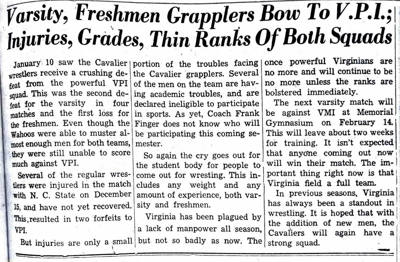 “Varsity, Freshmen Grapplers Bow to V.P.I; Injuries, Grades, Thin Ranks of Both Squads”