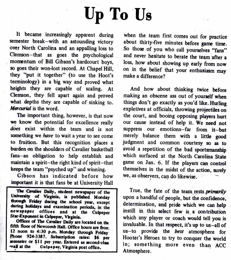 The Virginia basketball team is best described as “mercurial,” according to this 1973 sports article. Capable of both incredible wins and depressing defeats, the team’s success may hinge on an outside variable: its fans. The article urges students not only to show up, but to reconsider how they show up. Rather than cursing officials or heckling opposing players, fans are asked to channel their energy into “common courtesy,” citing “sportsmanship” as the winning formula.