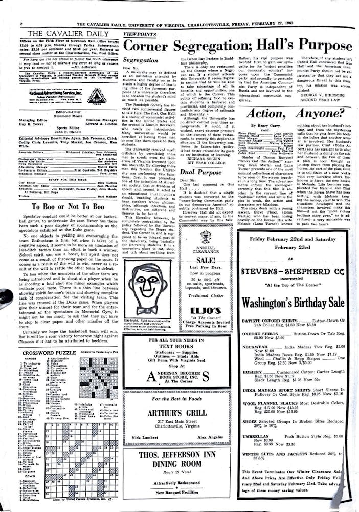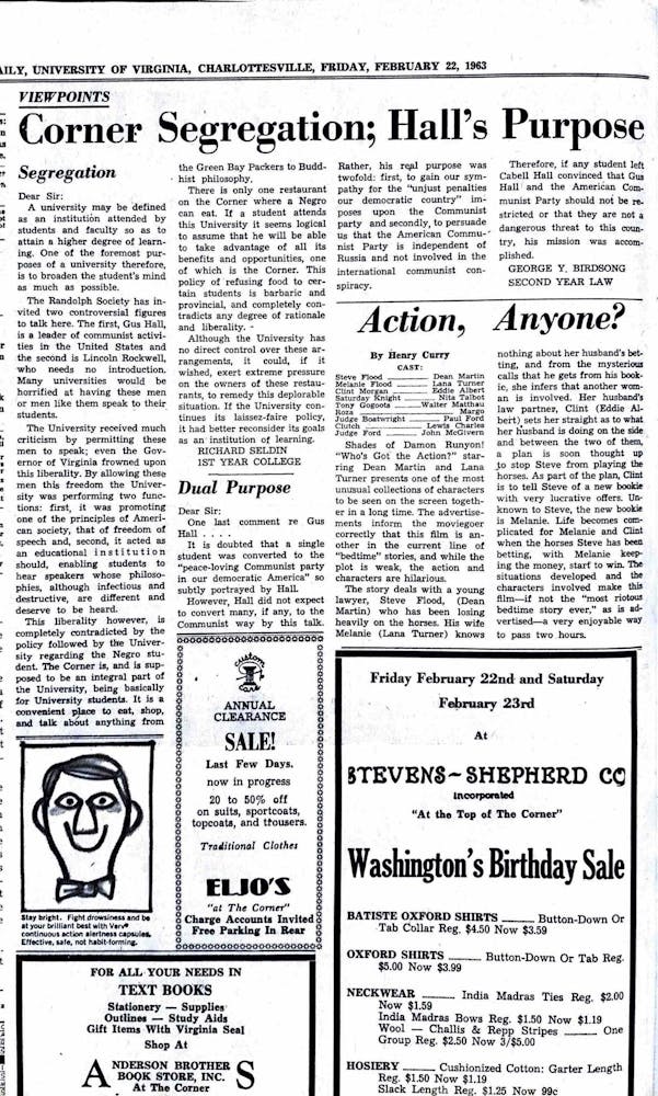 In 1963, only one Corner restaurant was open for Black students to eat, spend time and — most importantly to writer Richard Seldin — encounter a diversity of thought. Seldin argues that the University’s purpose should be to “broaden [a] student’s mind,” as it did when inviting controversial speakers to Grounds, yet notes that it does not extend this “liberality” to the Corner, a breeding place for discourse and education. This article critiques the University’s hypocrisy and calls on the administration to demand change from the restaurants’ owners.