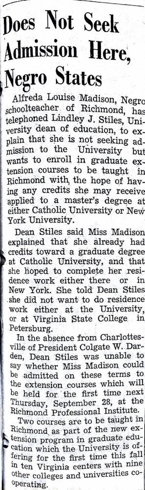 In September of 1950, African American schoolteacher, Alfreda Louise Madison pursued her graduate studies degree despite racial and systemic barriers. University Dean of Education Lindsey J. Stiles wrote to Madison expressing to her that because University President Colgate Darden was absent from Charlottesville, she was unable to confidently say whether Madison could enroll considering the circumstances for the time. Madison’s story is a common tale that reflects the commitment to higher education that Black individuals had during a time before civil and equal rights.