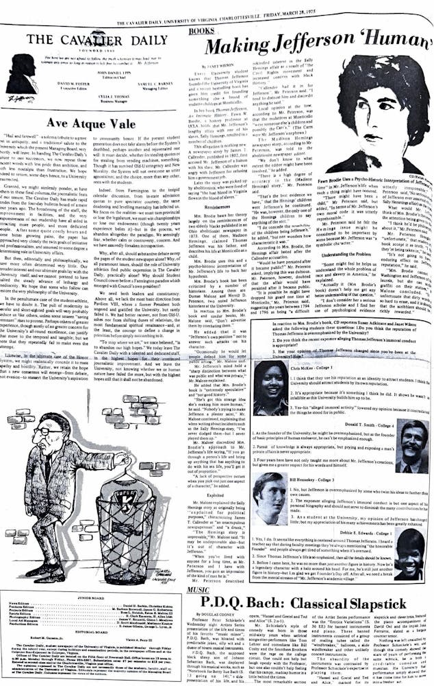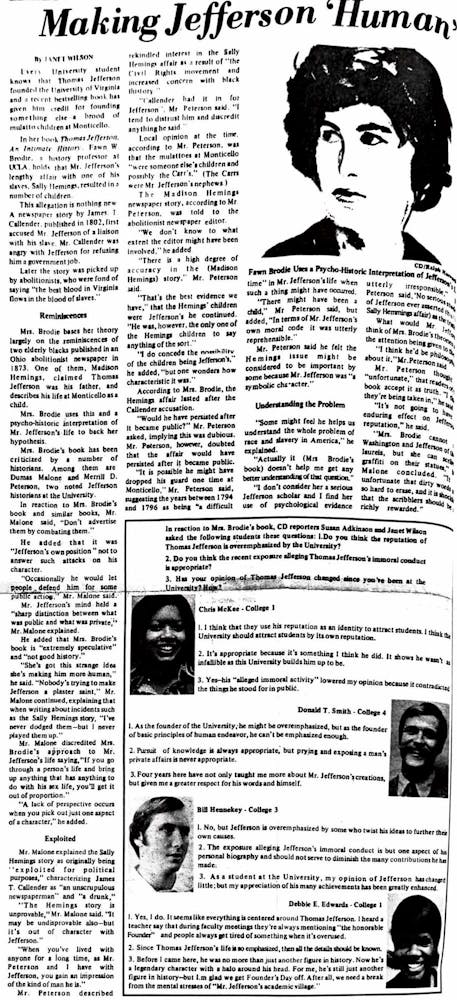In 1975, The Cavalier Daily discussed the controversial figure Thomas Jefferson. This article confronts Jefferson’s legacy and accomplishments when compared to his failures and hypocrisy regarding enslaved laborers. To get a student perspective, four students were interviewed, two Black women and two white men. The Black students emphasized that the University should be upfront about its founder’s reputation, whereas the white students said it’s inappropriate to expose a man’s private affairs considering all of his accomplishments for the University. This article shows the difficulty that Black students faced, and continue to face, when grappling with the legacy of racism and enslavement at the University and one of its most “honorable” figures.