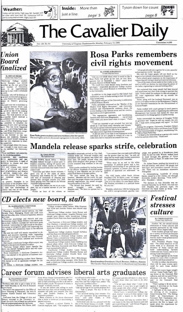 Civil rights activist Rosa Parks gave a speech in 1990 for the University’s celebration of Black History Month. Parks detailed the experience of her arrest when she refused to sit in the back of a bus in Montgomery, Alabama. Parks urged audience members to vote for a peaceful world and for change, stating that many people had been injured, arrested and even killed in an effort to make sure future generations could have their voices heard.