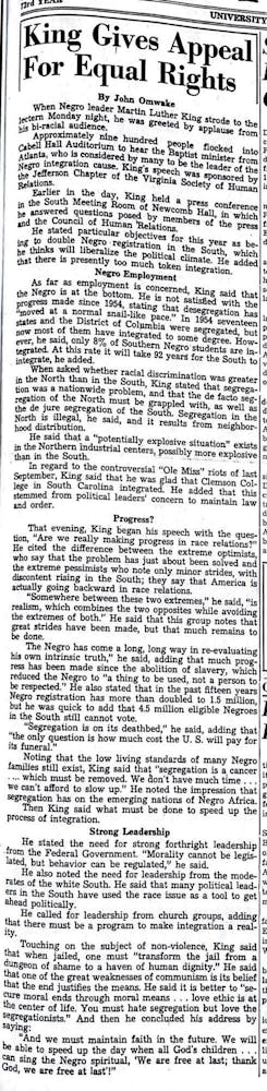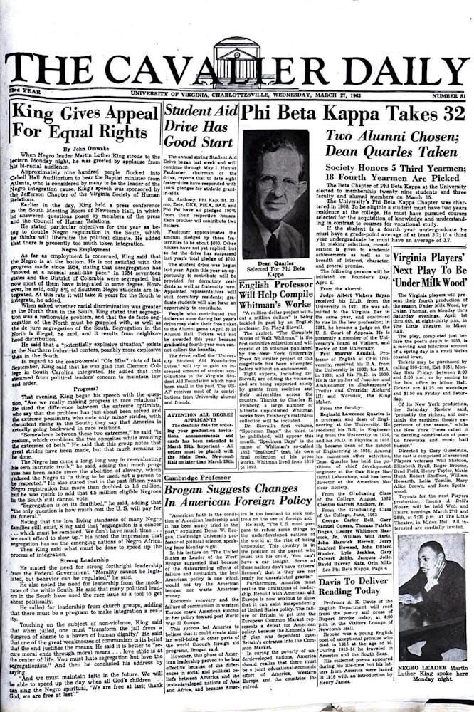 On Monday, March 25, 1963, Martin Luther King Jr. spoke at Old Cabell Hall, after a press conference earlier that day in the South Meeting Room of Newcomb Hall. During the press conference, he argued that segregation in the North was “potentially explosive” and resulted from de facto housing policies, rather than laws like in the South. King pushed for quicker change, specifically asking church groups, white Southern moderates and the federal government to show strong leadership in the face of anti-integration protests. "Segregation is on its deathbed,” King said. “The only question is how much cost the U.S. will pay for its funeral.”