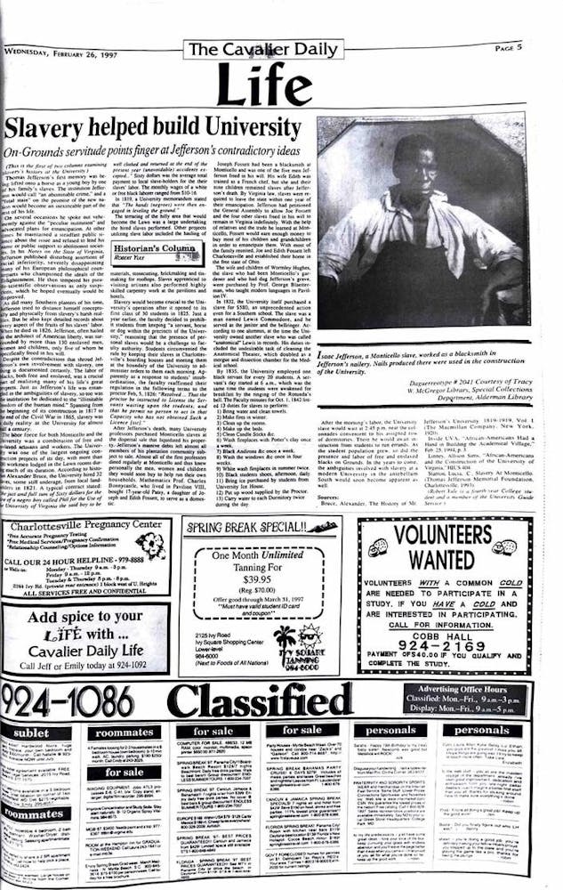 This author was a member of the University Guide Service. In this historian’s column, the author wrote about Thomas Jefferson’s complicated relationship with the institution of American slavery and the legacy of enslavement at the University.