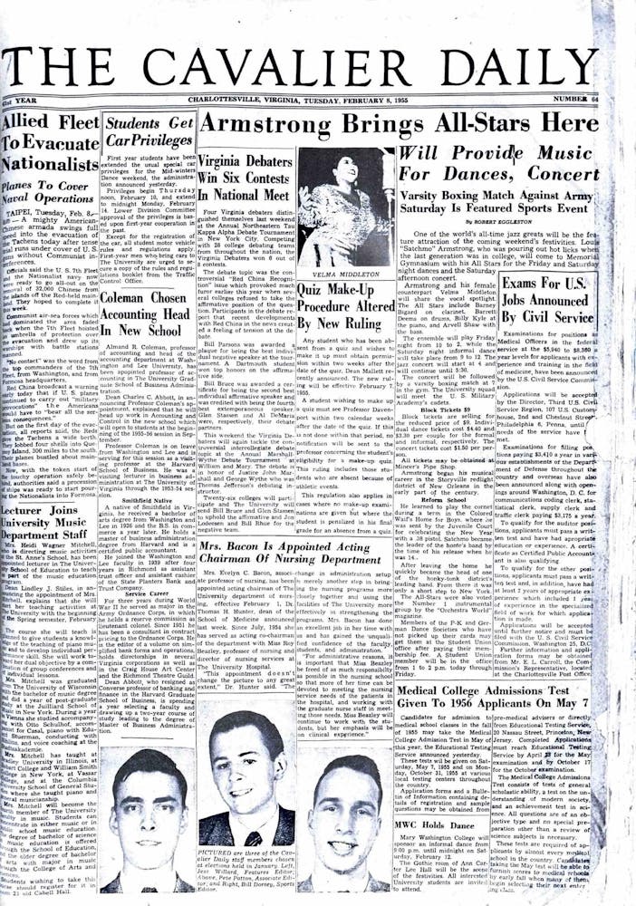 In 1955, Louis Armstrong was set to perform in Memorial Gymnasium for a weekend concert and dances alongside Velma Middleton and his All-Stars. Ranked first among instrumental groups by the magazine Orchestra World, Louis Armstrong and his All-Stars are “one of the world’s all-time jazz greats.”