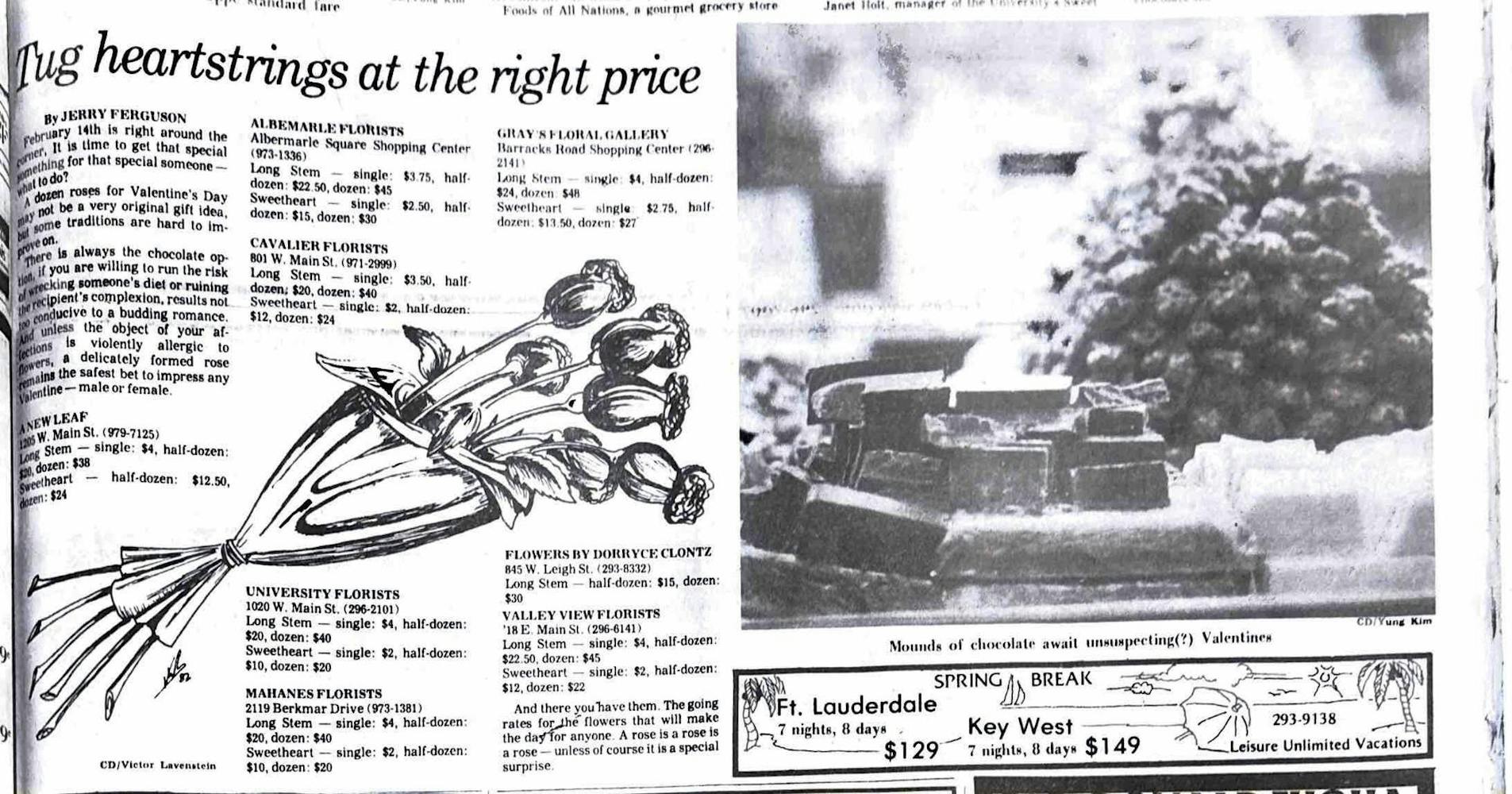 In a rather clever marketing strategy, this author reminds readers that although roses for Valentine’s Day are unoriginal, unlike chocolates, they do not risk ruining your lover’s complexion or diet. He urges readers to take the safe route and buy their special someone a bouquet from one of the local florists listed.