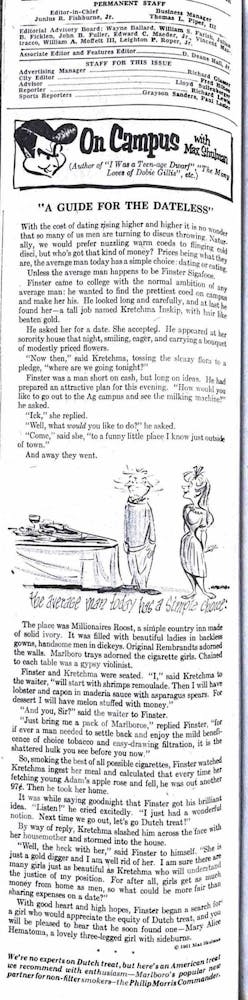 Max Shulman tells the story of a young bachelor, Finster Sigafoos, who came to college with the goal of finding the prettiest woman on Grounds. Having secured a date with a beautiful woman, he takes her out to dinner and is horrified when she orders a ridiculously expensive meal. He concludes that she is nothing but a gold digger and sets his sights on the only woman who appreciates the value of splitting the cost of the meal — “Mary Alice Hematoma, a lovely three-legged girl with sideburns.”