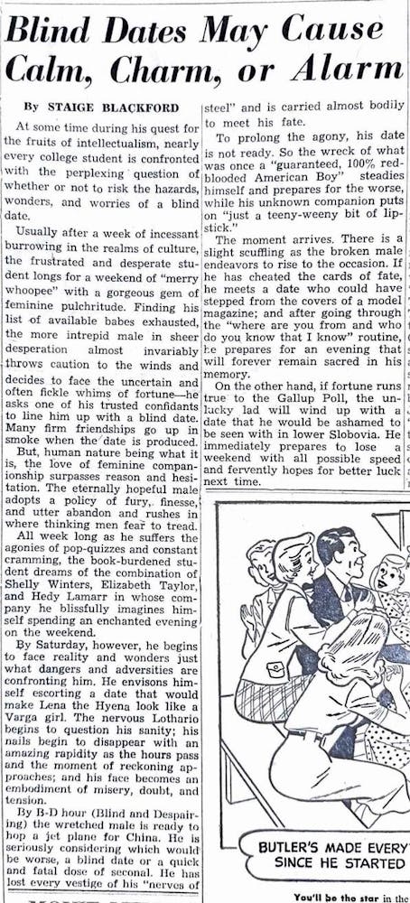 This author details the kinds of worries that might plague a young bachelor considering a blind date in 1950. After a long week of schoolwork, exams and constant stress, a blind date could either mean a true love match and a weekend well-spent or a complete dead end.