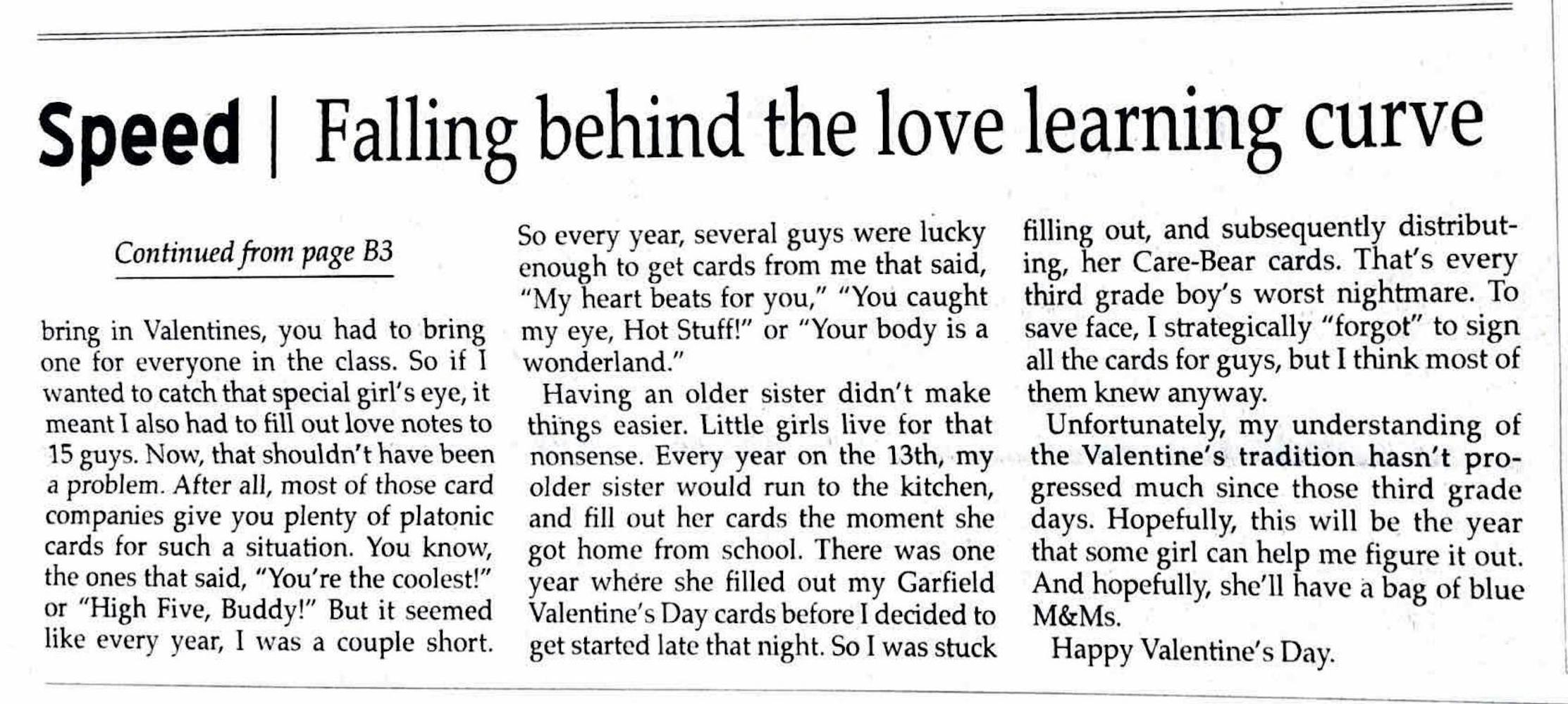 This optimistic author hopes to help readers find some semblance of joy during a holiday that could be dreadful for the single or even for those in a relationship. He reminds readers of the silliness of the Valentine’s Days of our youth, when we cut up asymmetric paper hearts and awkwardly shared candy with classmates. In the card aisle of a local shop, he feels a similar sense of comedic relief while reading some absurd Valentine’s card headers, ranging from “Someone Special” to “For Anyone” to “Yee-Haw.”
