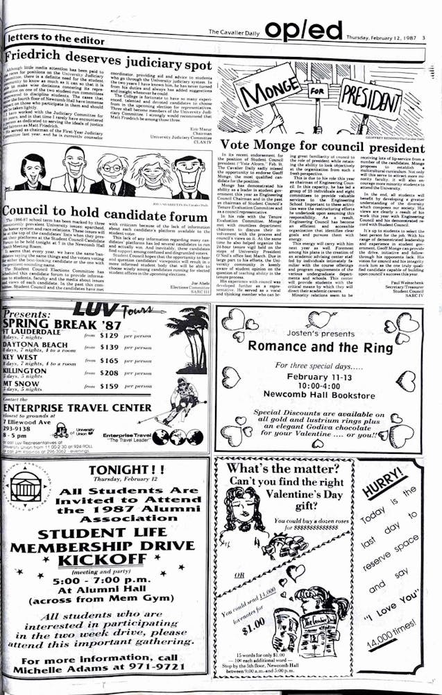 In this advertisement, The Cavalier Daily hoped to persuade readers to purchase a love note to be featured on the Valentine’s Day edition of the newspaper. For a dollar, readers could submit a short note at Newcomb Hall to surprise that special someone.