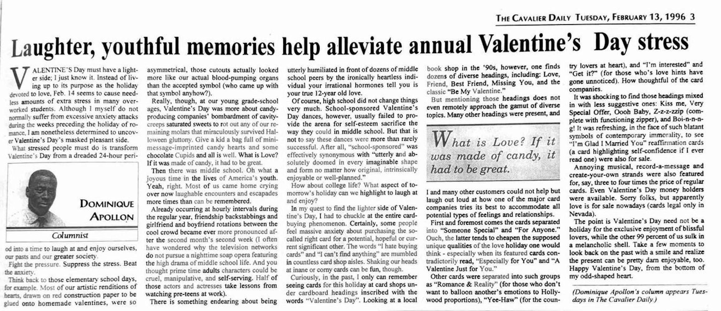 This week in From the Archives, we look back on Valentine’s Day festivities and romance at the University. From advice on how to properly blind date to personal takes on the not-so-lovely aspects of Valentine’s Day stress, these authors paint a vibrant picture of how this holiday of love has impacted Hoos for decades.