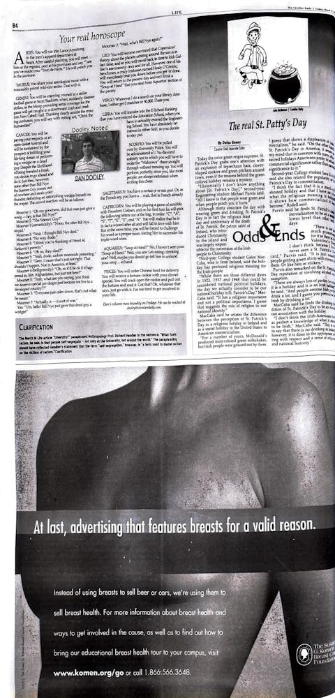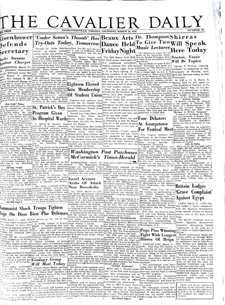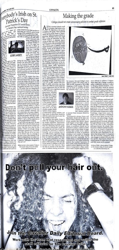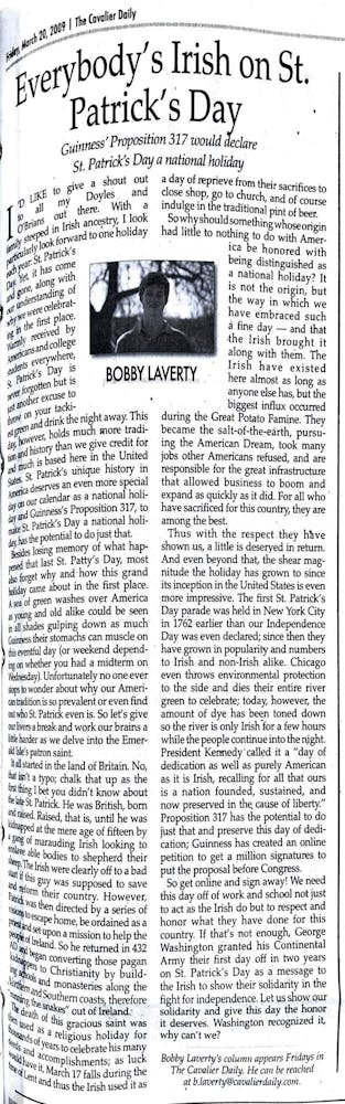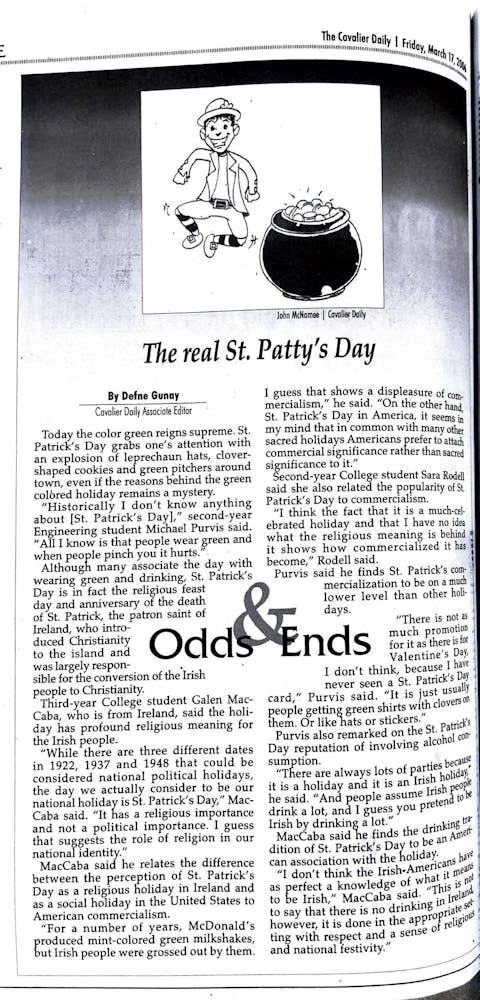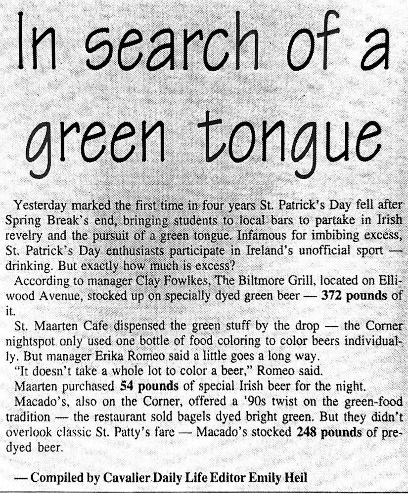 For the first time in four years, St. Patrick’s Day occurred when students were back on Grounds from spring break. Local bars drew students with specially dyed green beer, and one Corner spot offered bright green bagels.
