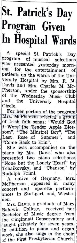 The Wednesday Music Club and the University Hospital Circle sponsored a special program for St. Patrick’s Day. Irish folk songs and piano pieces were performed for patients at the University Hospital.
