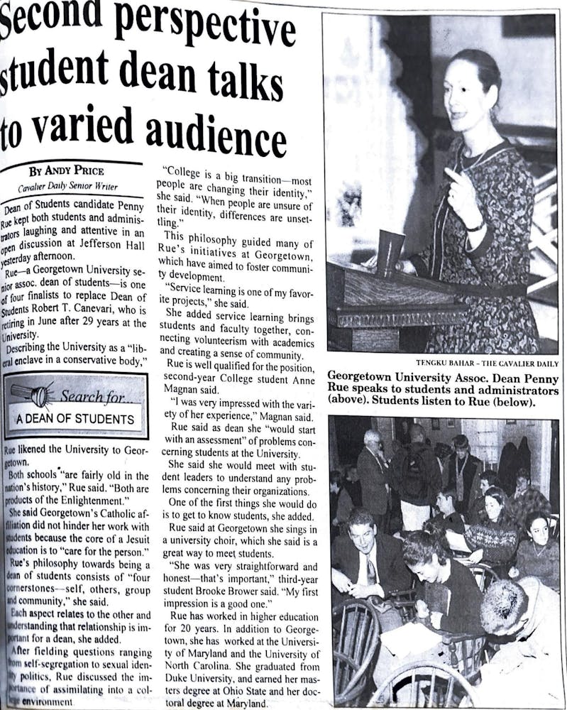 During the search to replace retiring Dean of Students Robert T. Canevari, finalist Penny Rue addressed students and administrators in Jefferson Hall. Rue, the senior associate dean of students at Georgetown University, spoke about her guiding philosophy and plans for the position, including wanting to get to know students. Students in attendance were impressed with her experience and honesty, and left the discussion feeling confident in her abilities.