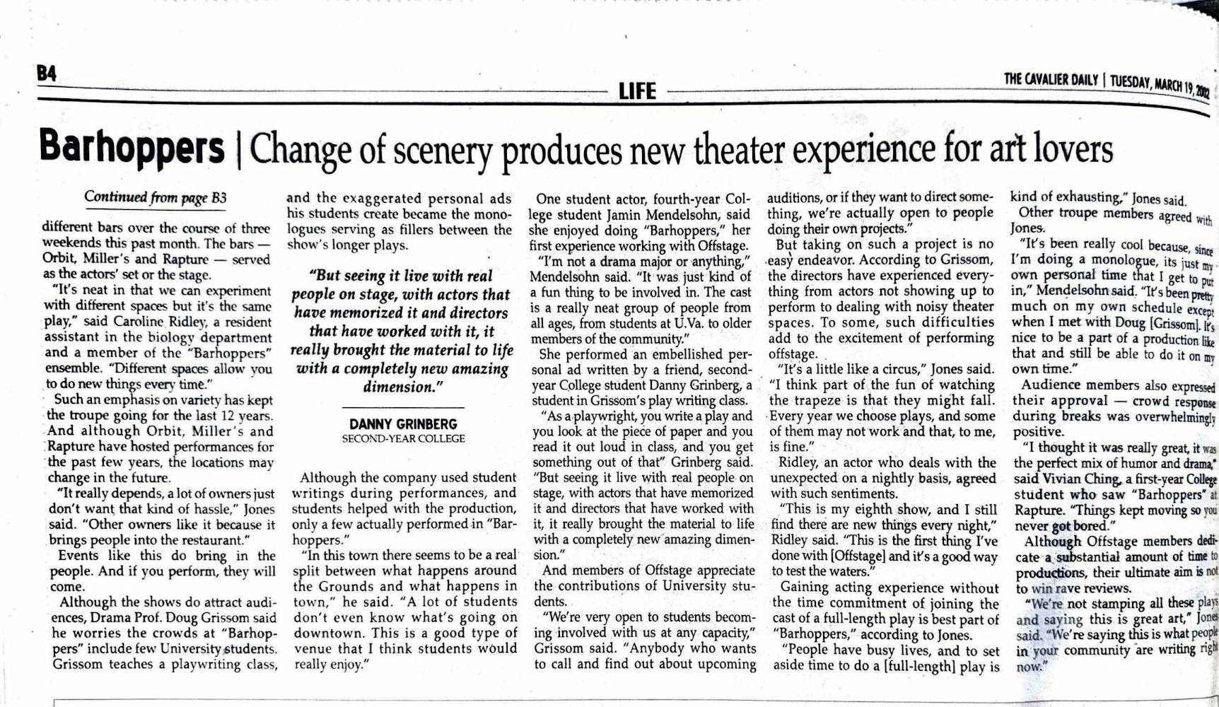 The Offstage Theater Company worked alongside University students and Charlottesville locals to create “Barhoppers,” an ensemble that performed short plays about bars, in bars. The show allowed students to gain experience in performing art without the time commitment, and for the audience, a front-row feel in a relaxed, comfortable setting. Barhoppers did not set out to redefine theater, it was simply a celebration of local talent, one that delighted audiences with its ambition.