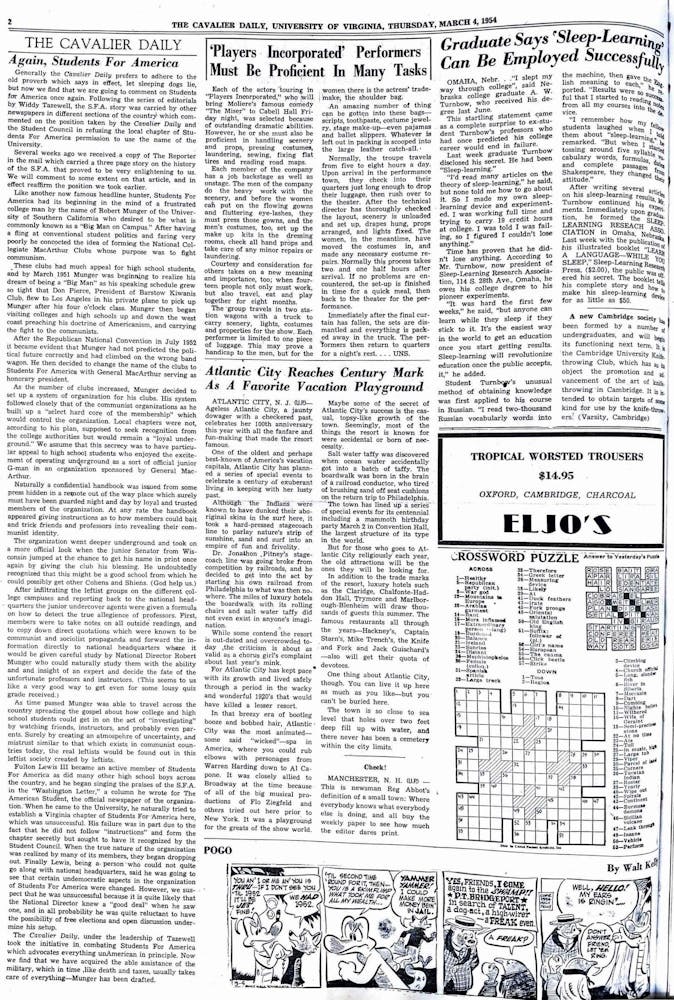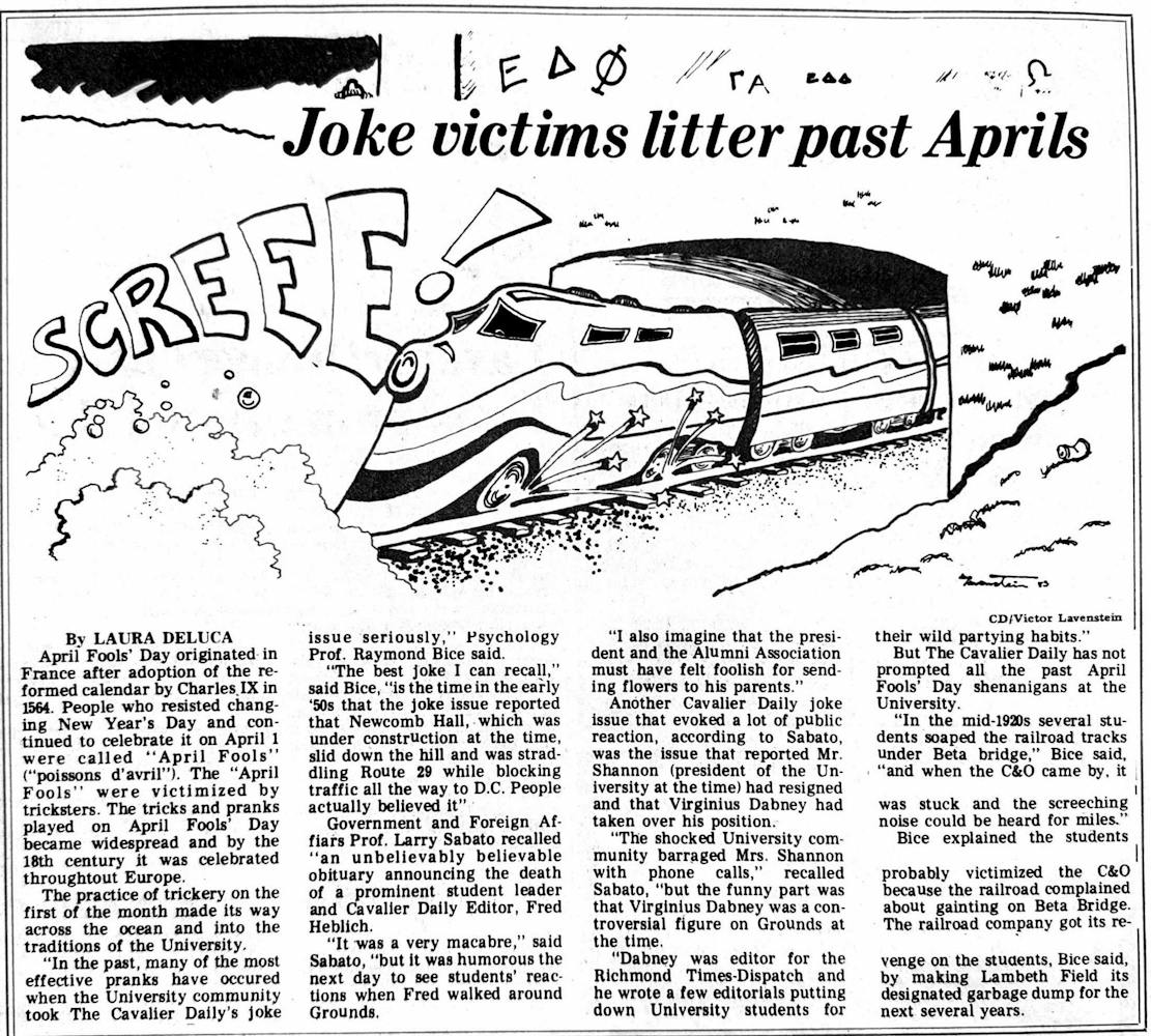 In this article, the author explores the history of April Fools’ Day and its 16th-century French origins. She also interviews professors like Larry Sabato, who reminisces on past U.Va. April Fools’ pranks like a fake Cavalier Daily article announcing the death of the then-editor Fred Heblich and University students in the 1920s soaping the railroad tracks under Beta Bridge.