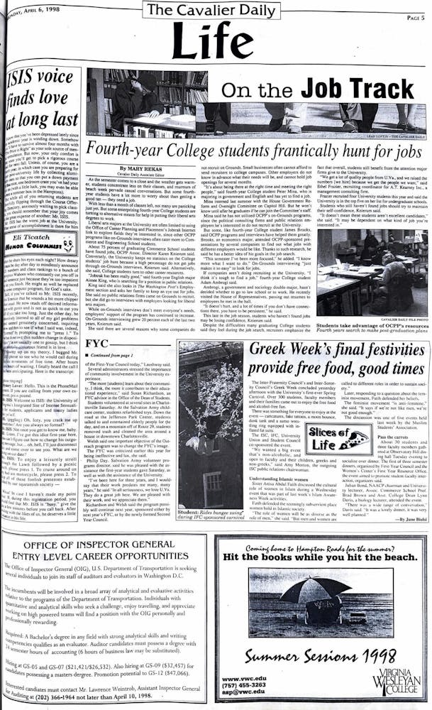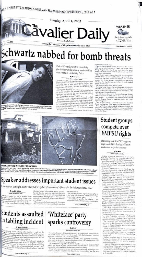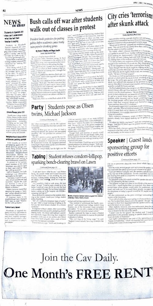 In this April Fools’ edition of The Cavalier Daily, the newspaper published a variety of prank articles, with joke titles like: “Bush calls off war after students walk out of class in protest” and “Students in Spanish 201 class can’t understand what the hell their teacher is saying.” The spread also features prank authors like “Nancy Drew” and “Weird Al Unkovic.”