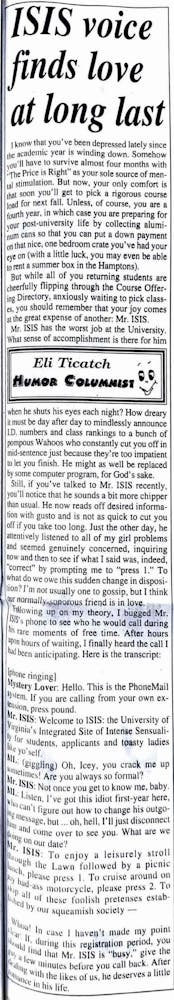 In this humor column, writer Eli Ticatch jokes that the University’s automated phone registration system, “Mr. ISIS,” is an overworked employee deserving of love after dealing with impatient students for years. Ticatch hilariously suggests that Mr. ISIS’s typical robo-tone voice seems to sound as of late, however, as he appears to have fallen in love.