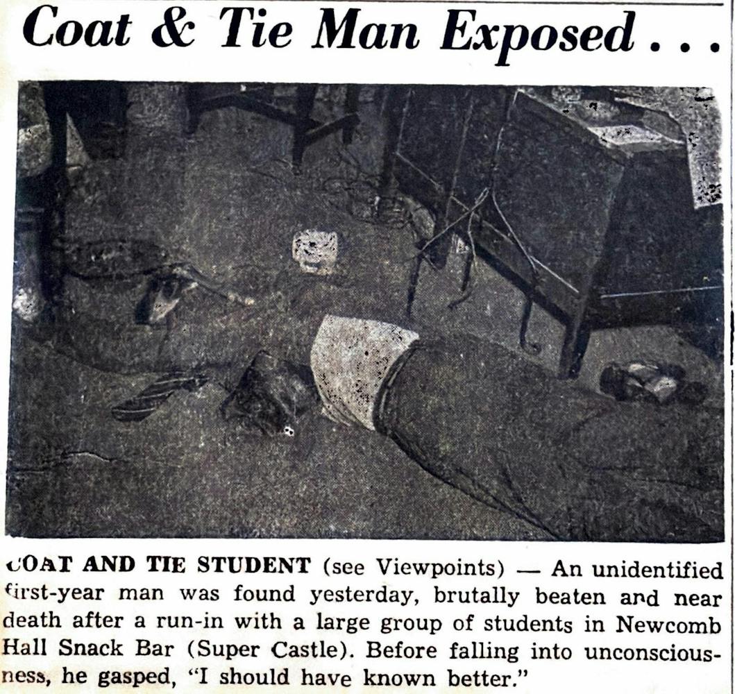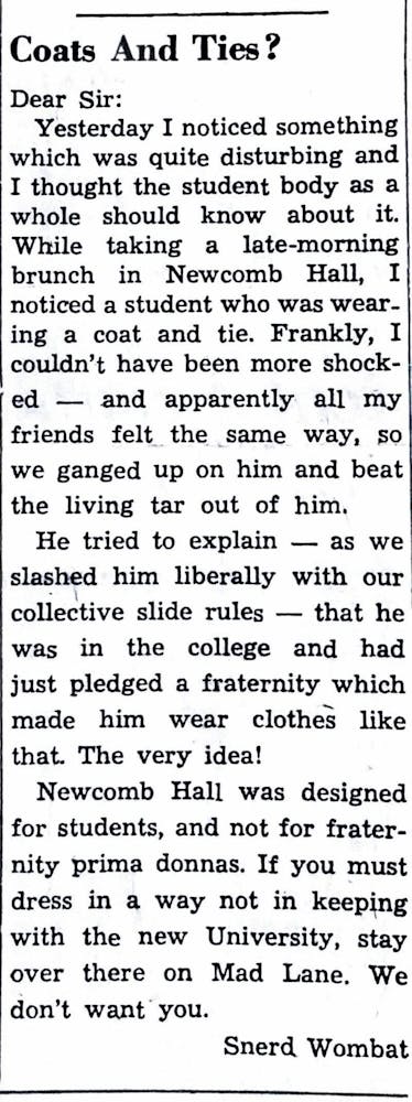 This prank article pokes fun at “fraternity prima donnas” who dress in suits and ties. The author, jokingly of course, describes ganging up with others to ferociously beat up a boy dressed in a full suit in Newcomb Hall, snarking “Stay over there on Mad Lane. We don’t want you.”