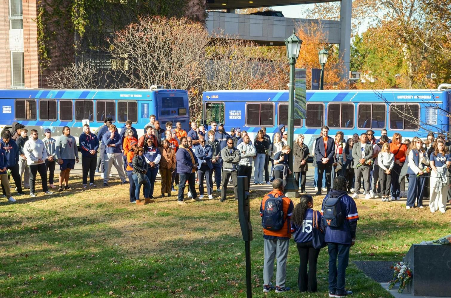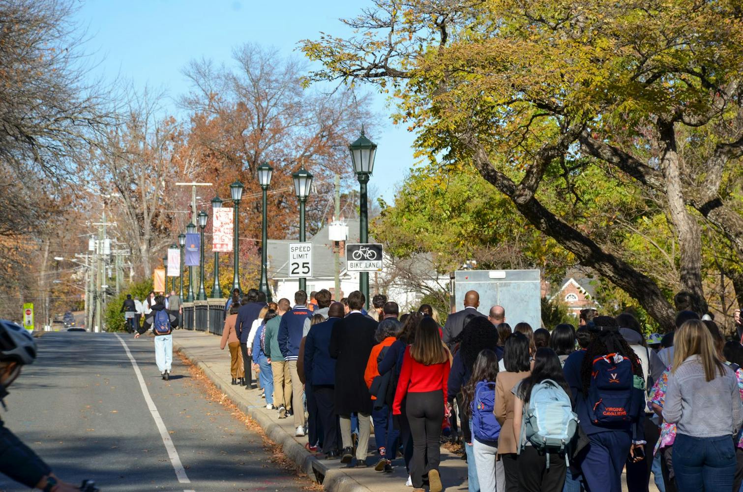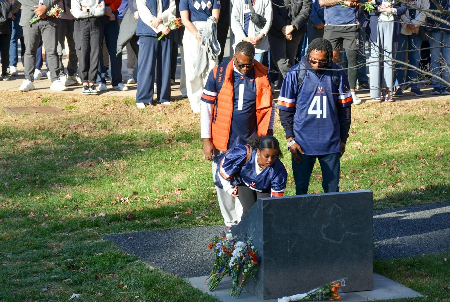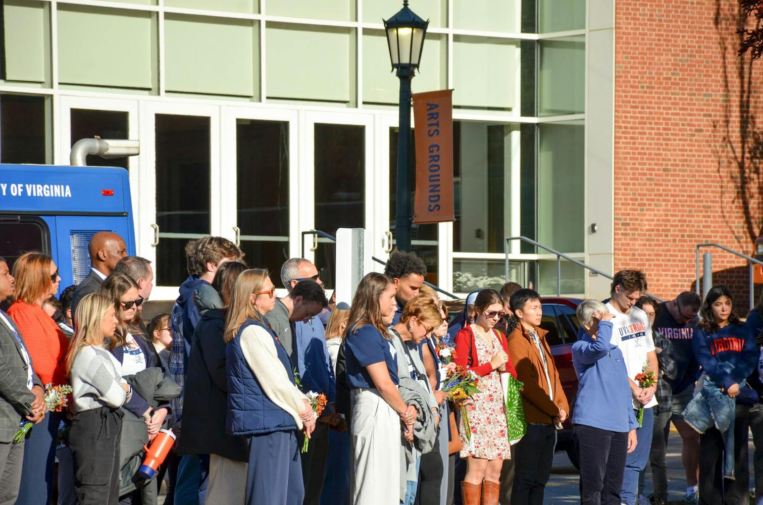 At 1:55 p.m. on Thursday, Nov. 13, the University Chapel bells played the first verse of “Amazing Grace” before ringing the three final chimes, honoring the lives of Lavel Davis Jr., D’Sean Perry and Devin Chandler who were killed during the University shooting three years ago. Immediately after the bell toll, attendees began a memorial march from the Chapel to the memorial tree at the Betsy and John Casteen Arts Grounds, near where the tragic shooting took place three years ago, for a remembrance ceremony.