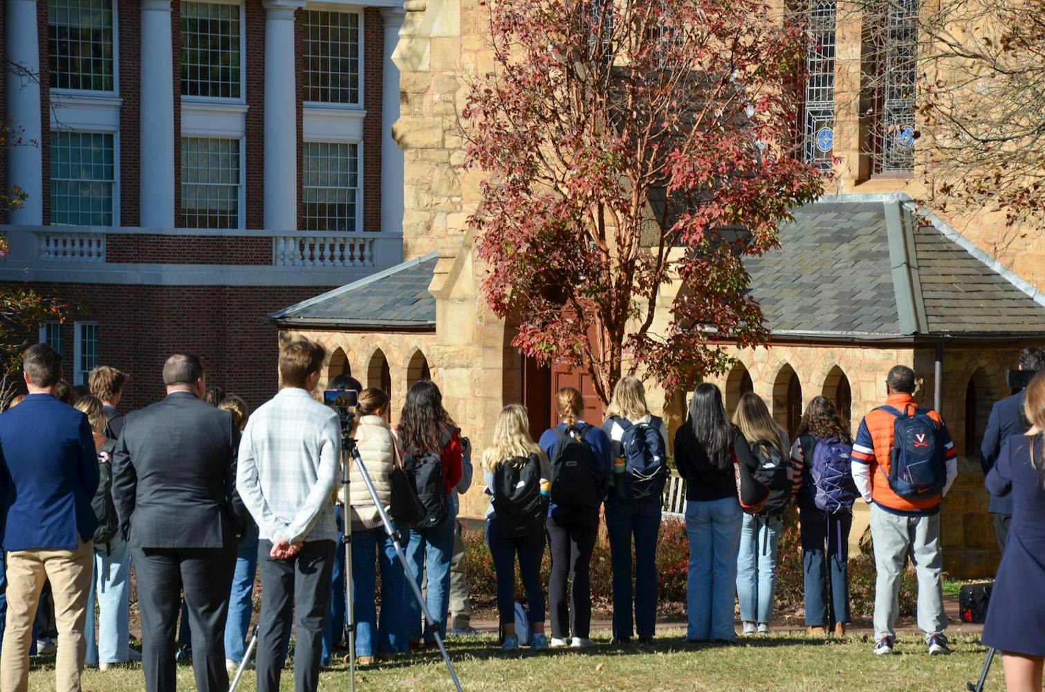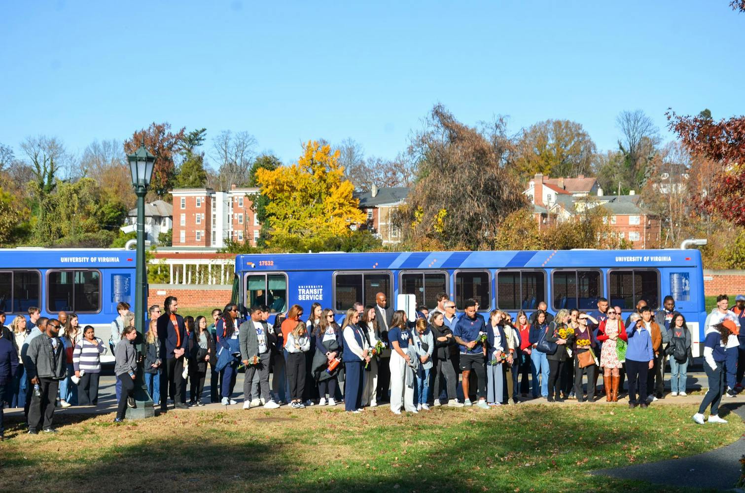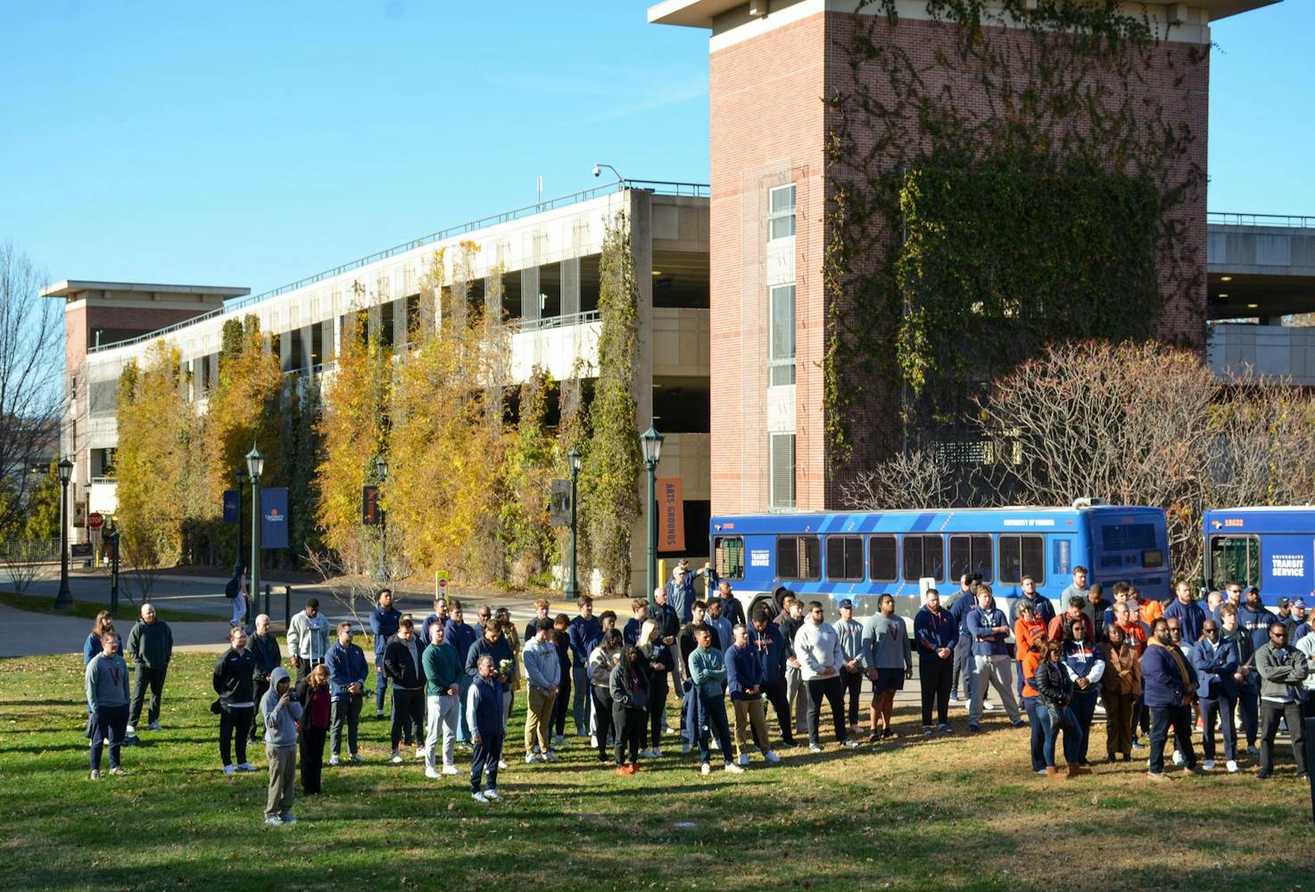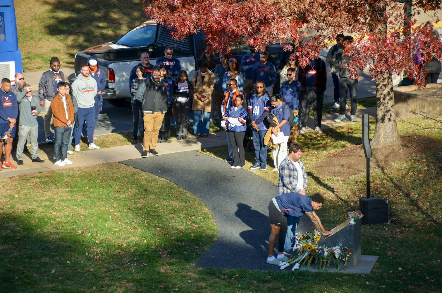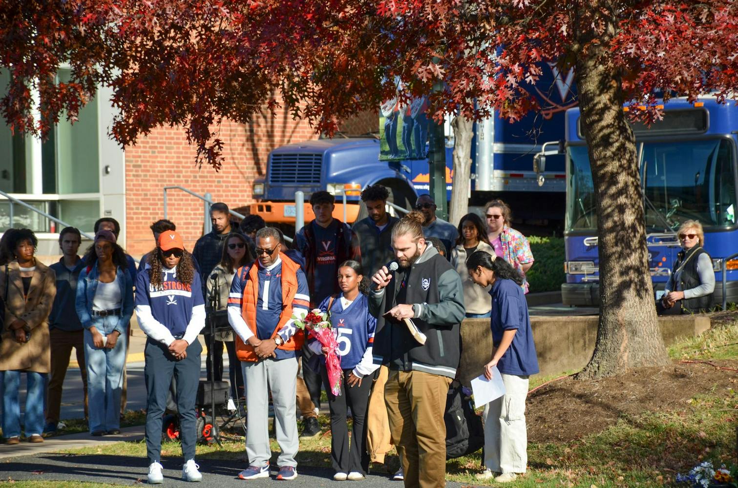 At 1:55 p.m. on Thursday, Nov. 13, the University Chapel bells played the first verse of “Amazing Grace” before ringing the three final chimes, honoring the lives of Lavel Davis Jr., D’Sean Perry and Devin Chandler who were killed during the University shooting three years ago. Immediately after the bell toll, attendees began a memorial march from the Chapel to the memorial tree at the Betsy and John Casteen Arts Grounds, near where the tragic shooting took place three years ago, for a remembrance ceremony.