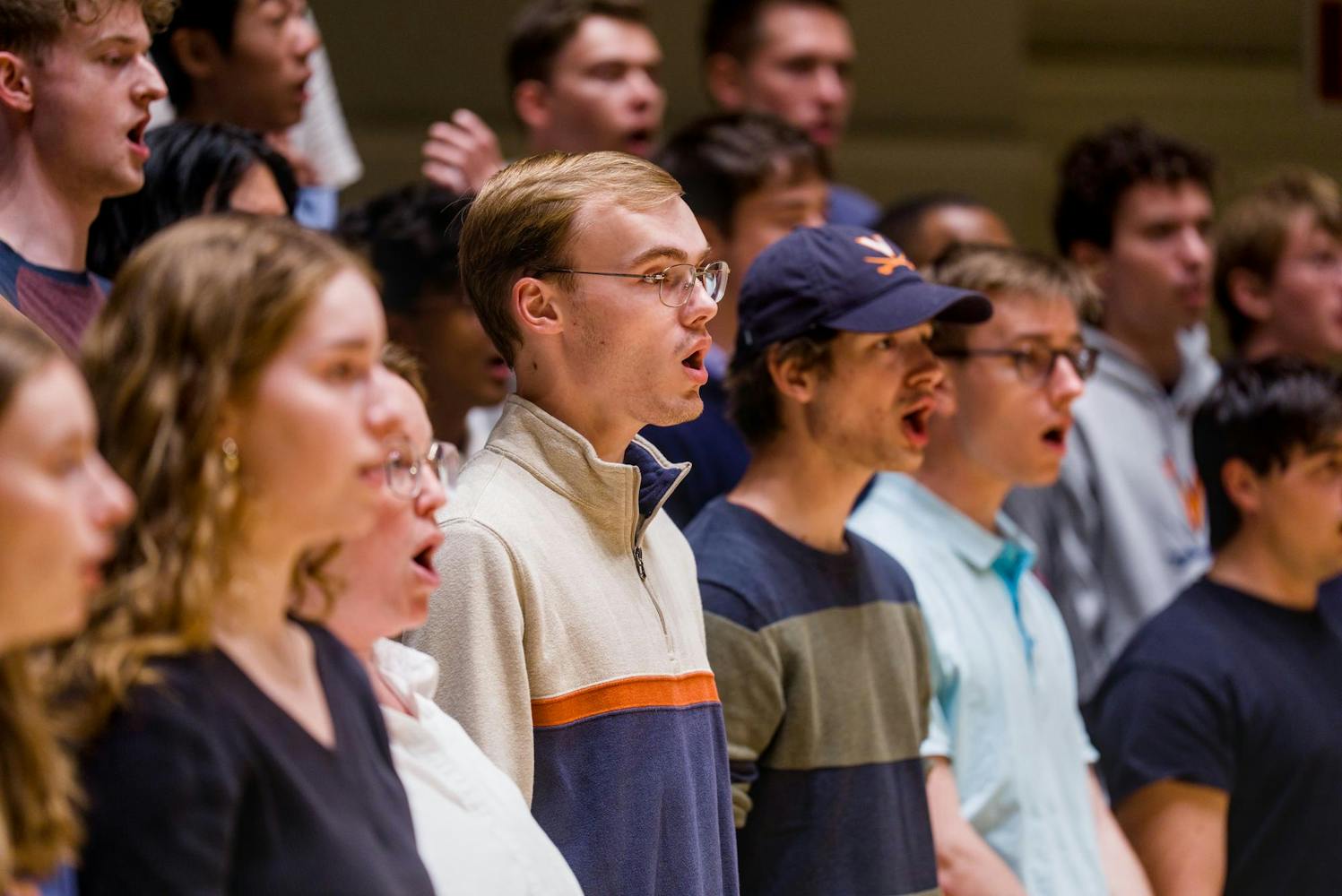 “Ten thousand voices sing thy acclaim” – a line from the oft-forgotten official alma mater of the University, "Virginia, Hail, All Hail." While not quite ten thousand, over a hundred voices worked hard in rehearsal to come together Friday evening in Old Cabell Hall for a performance worth acclaiming.