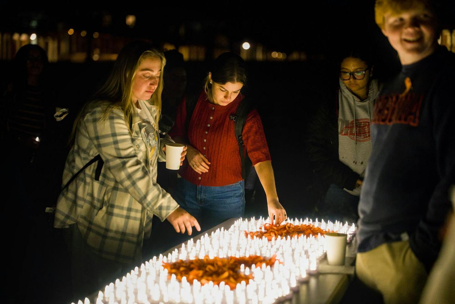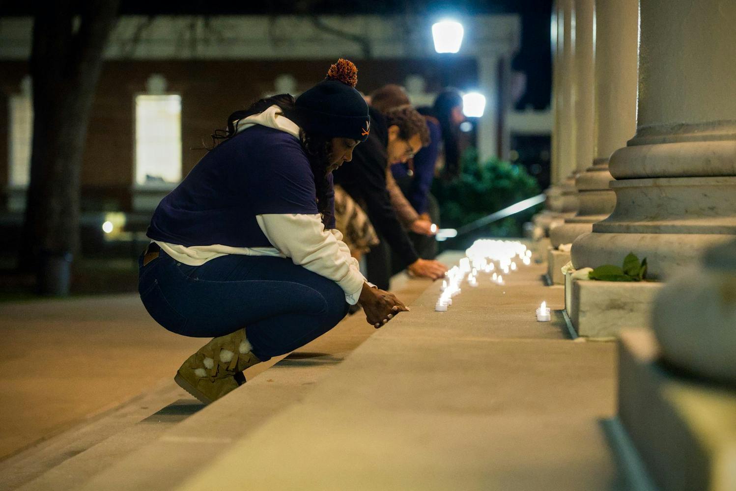 A silent vigil, organized by the Class of 2026, was held on the South Lawn to honor the lives of Lavel Davis Jr., Devin Chandler, and D’Sean Perry who were killed in the University shooting Nov. 13, 2022. Students and community members came together to write notes on a banner, share apple cider and hot chocolate, and leave candles on the steps of Old Cabell Hall. The Class of 2026 will be the last undergraduate class to have been students at the time of the tragedy.