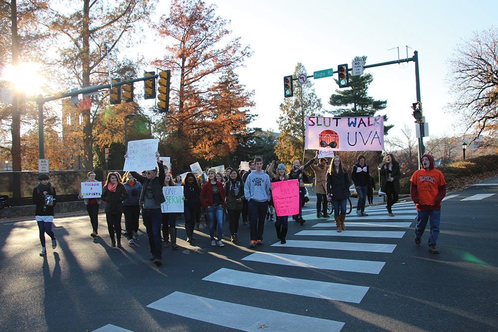 University students hosted a “Slut Walk” Friday afternoon to protest rape culture and sexual assault on Grounds. Protesters walked from the Amphitheatre, to the Lawn, the Phi Kappa Psi fraternity house, the Sigma Alpha Epsilon fraternity house and Brooks Hall, before ending at Peabody Hall, where they wrote on Post-it notes and stuck them to the building's doors.