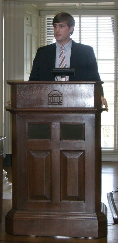 [caption id="attachment_34217" align="alignleft" width="145" caption="Student Council President Colin Hood spoke at an event held in the Dome Room of the Rotunda yesterday night during the official switchover to the newest administration.