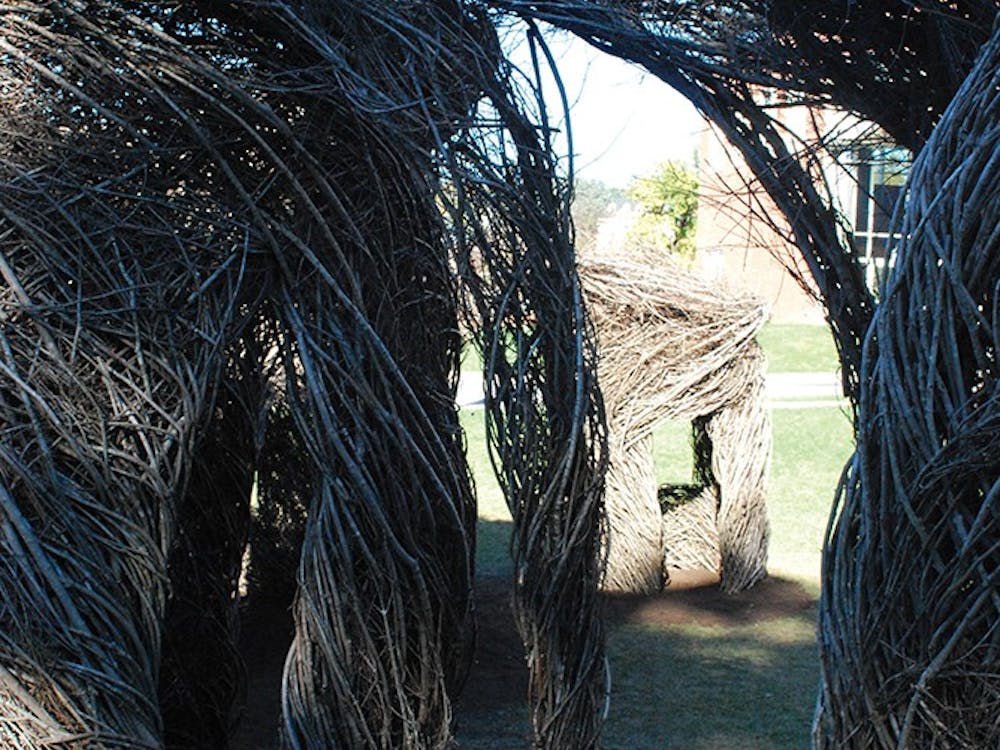 By Flo Overfelt | October 22, 2013Patrick Dougherty would have no problem saying his work is “for the birds.” Currently on display at the Fralin Museum of Art, Dougherty’s “Stickwork” consists of thousands of wood saplings twisted and twined together into a “Stickwork” sculpture.