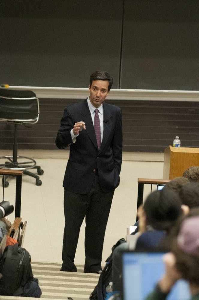 Former Puerto Rico Gov. Luis Fortuño about the need for the Republican party to make itself more attractive to Hispanic voters, especially after Romney’s loss in the 2012 election, in Politics Prof. Larry Sabato’s class on Monday. Fortuño showed slides with headings like “The Latino Problem,” which he recently used in a presentation to Republican leaders in Congress. His presentation addressed data from Hispanic voters in the 2012 election, which showed the feeling that the GOP does not respect the values and concerns of Hispanics.