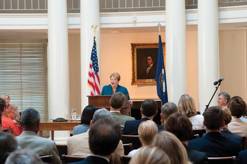 [caption id="attachment_44329" align="alignleft" width="300" caption="President Teresa A. Sullivan held a press event yesterday to announce the decision to employ John Simon as provost.
